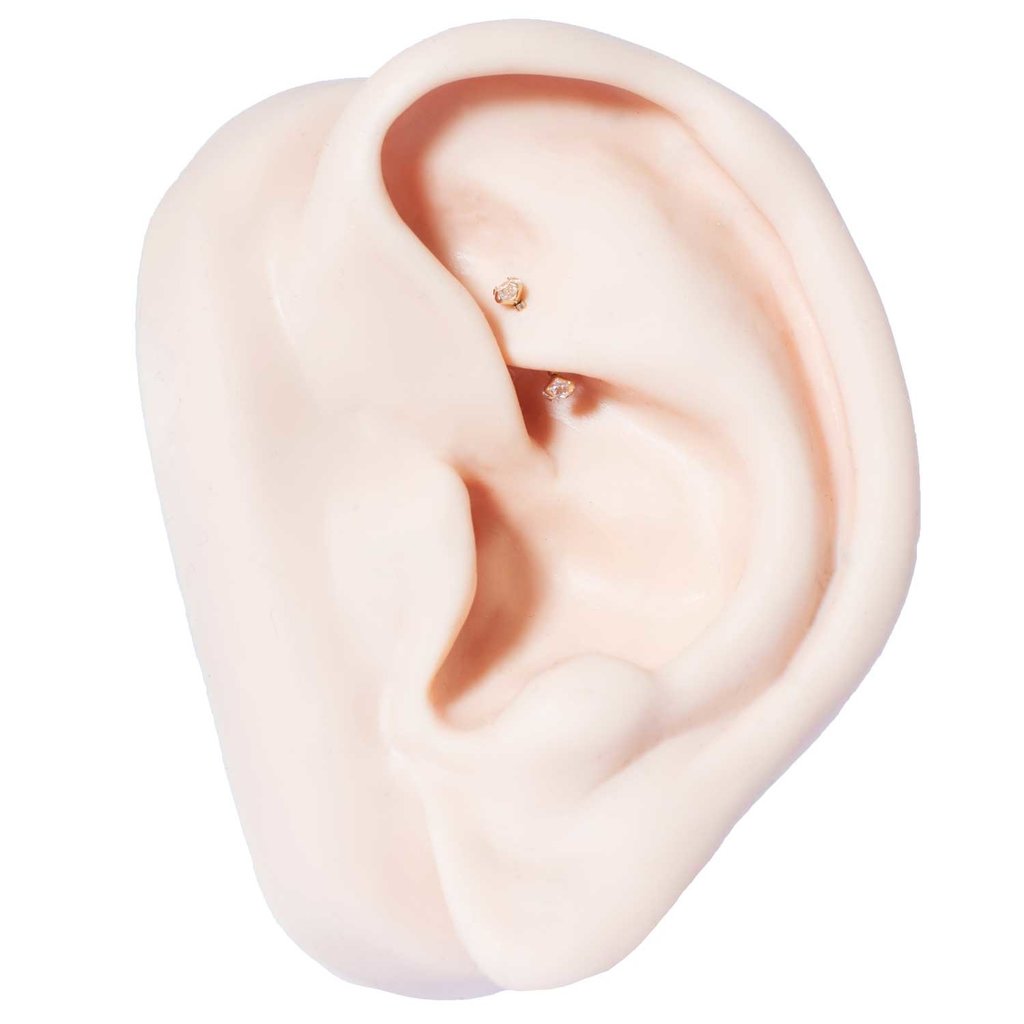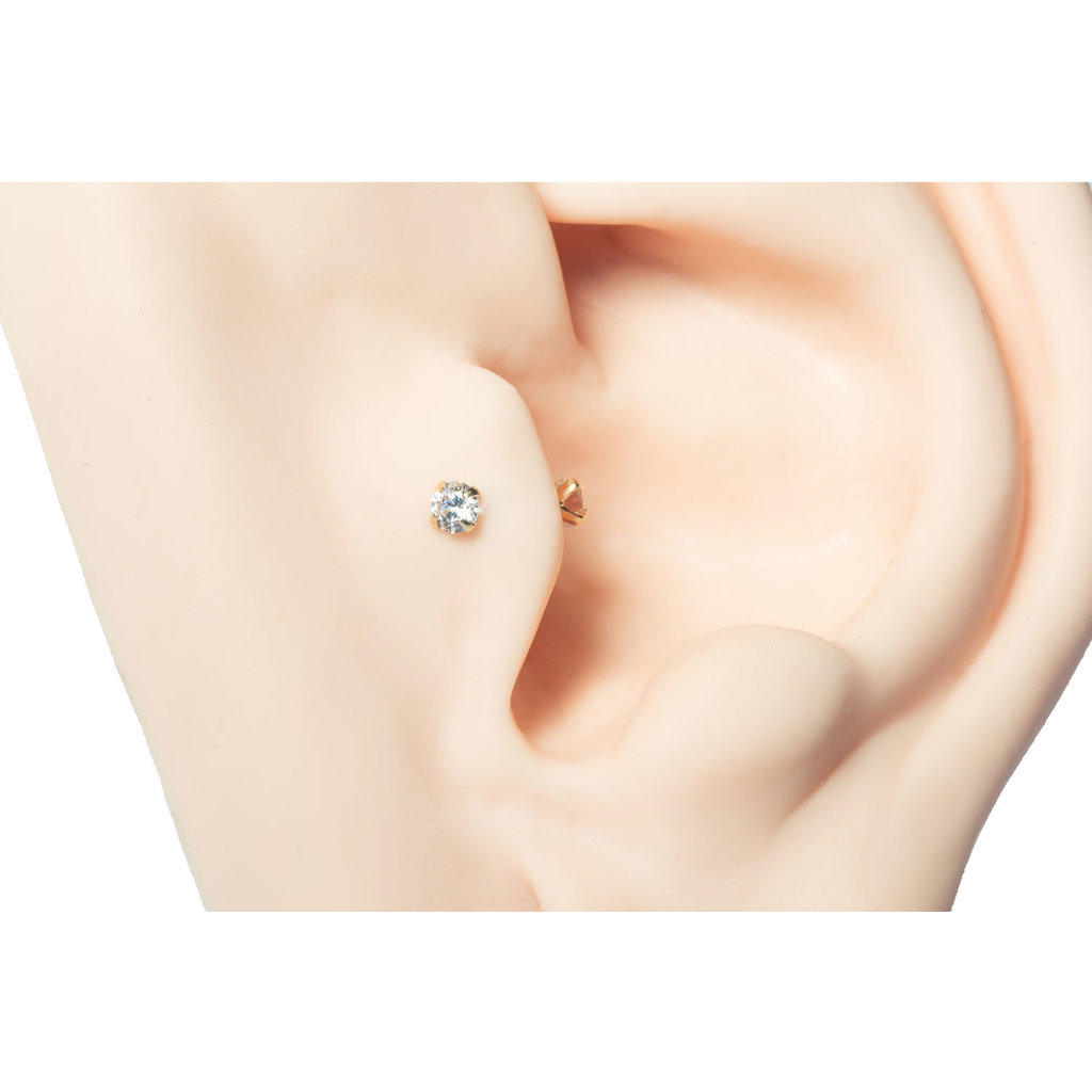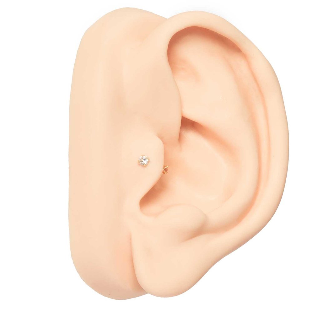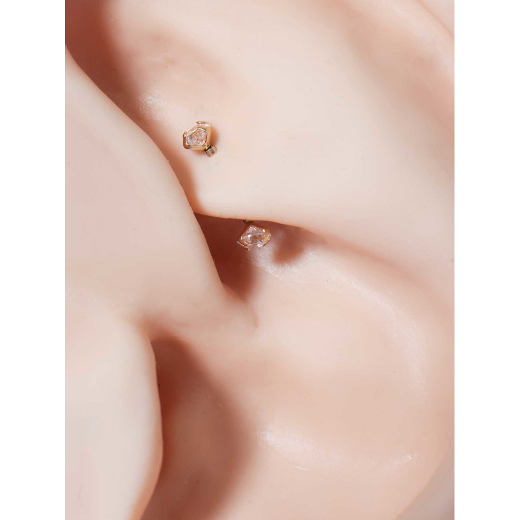 This solid gold banana barbell features sparkling balls inlaid with clear-white crystals! The barbell post has a thickness of 1,2mm and the length of 8mm. Ideal for eyebrow piercings but also very suitable for various other piercings.