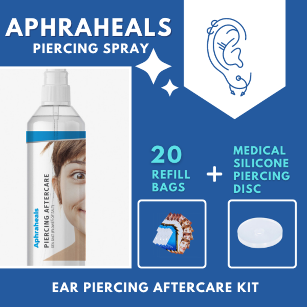 This set contains one bottle including Aphraheals sachet plus 20 refill sachets and one box of Medical Silicone Piercing Disc (2 pieces).