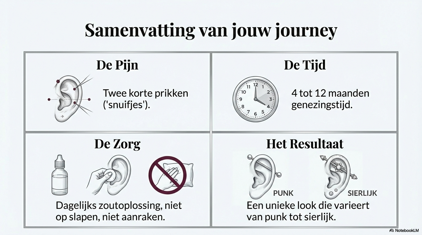 Reinig de piercing twee keer per dag met een steriele zoutoplossing. Was altijd eerst je handen voordat je de piercing aanraakt. Draai of speel niet met het sieraad, ook niet als het begint te jeuken. Vermijd druk op het oor en slaap niet op de piercing zolang deze geneest.
