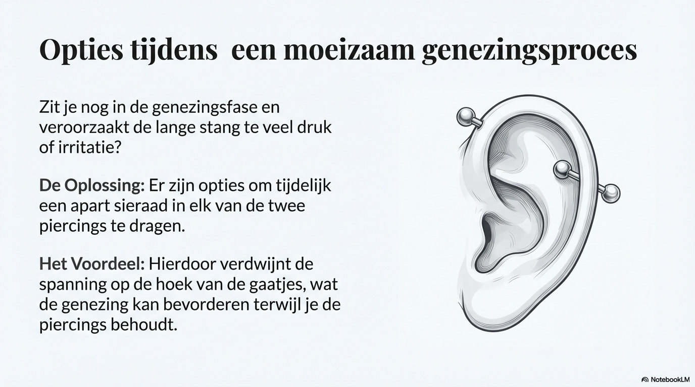 Wie nog in het genezingsproces zit maar toch wil variëren, kan in sommige gevallen tijdelijk kiezen voor twee losse sieraden in plaats van één lange barbell. Dit gebeurt altijd in overleg met een professional.