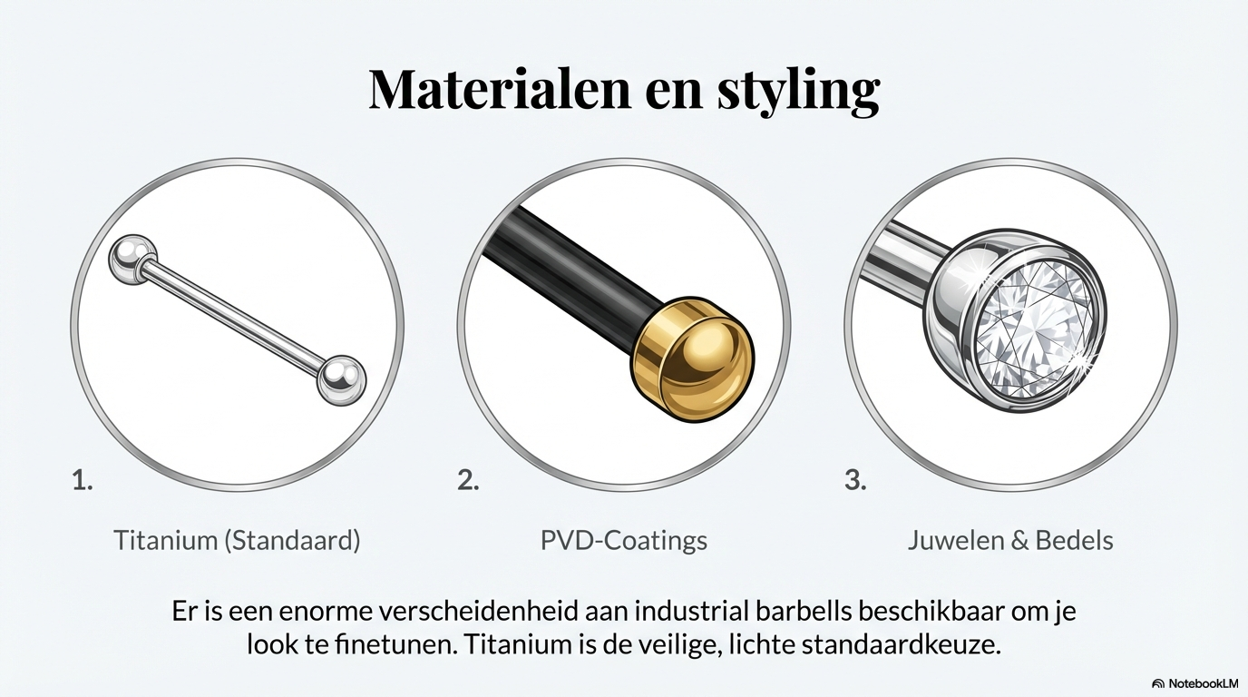 Is de industrial volledig genezen, dan zijn de mogelijkheden groot. Er bestaat een enorme variatie aan industrial barbells, van strak en minimalistisch tot uitgesproken en decoratief. Veel gebruikte materialen zijn implant-grade titanium en massief goud. Ook zijn er varianten met edelstenen, bedels en PVD-coatings.