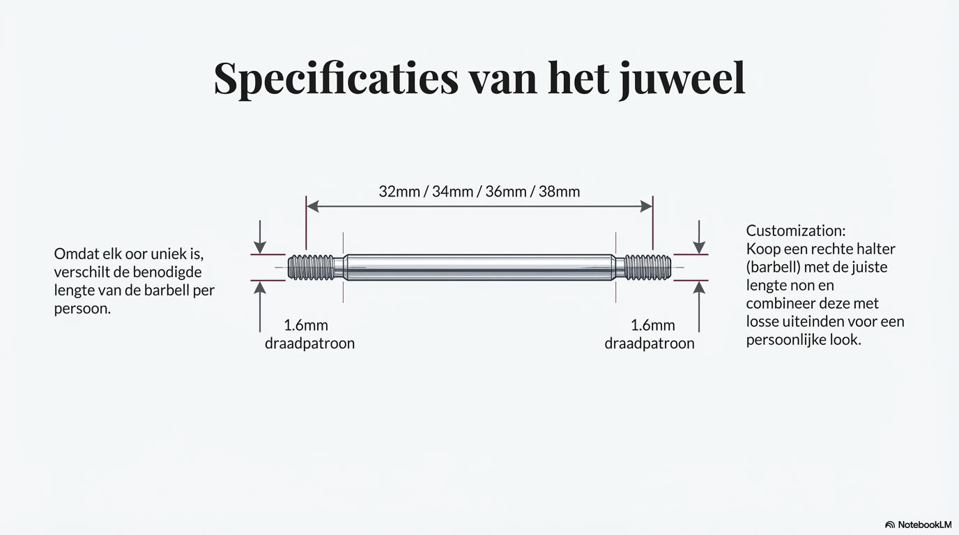 De lengte van de barbell verschilt per persoon, omdat elk oor uniek is. Veel voorkomende lengtes liggen tussen de 32 en 38 millimeter. Een juiste lengte is essentieel om spanning op het kraakbeen te voorkomen.