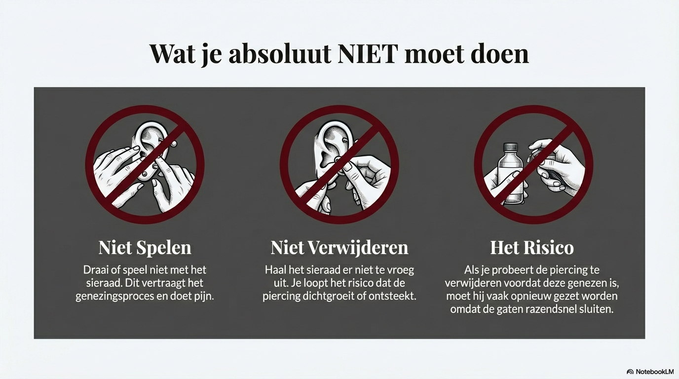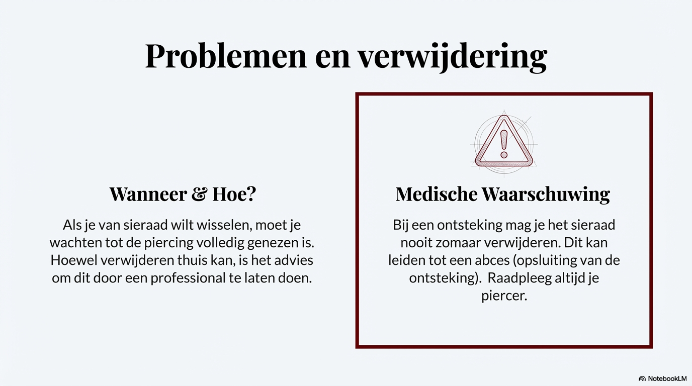 Verwijder het sieraad niet voordat de piercing volledig genezen is. Te vroeg verwijderen vergroot de kans op dichtgroeien, scheef genezen of ontstekingen.