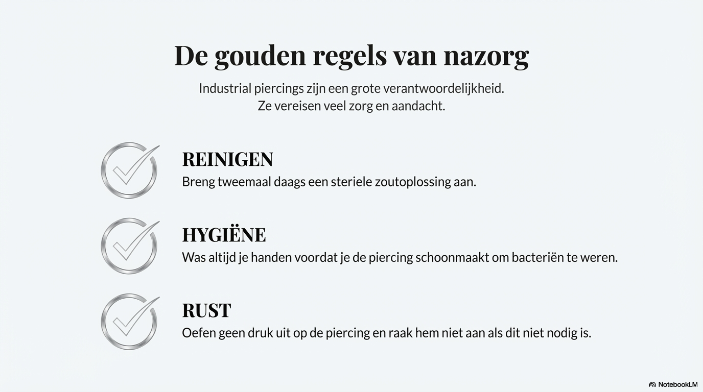Een industrial piercing vereist consequente nazorg. Dagelijkse verzorging is geen optie, maar een vereiste.