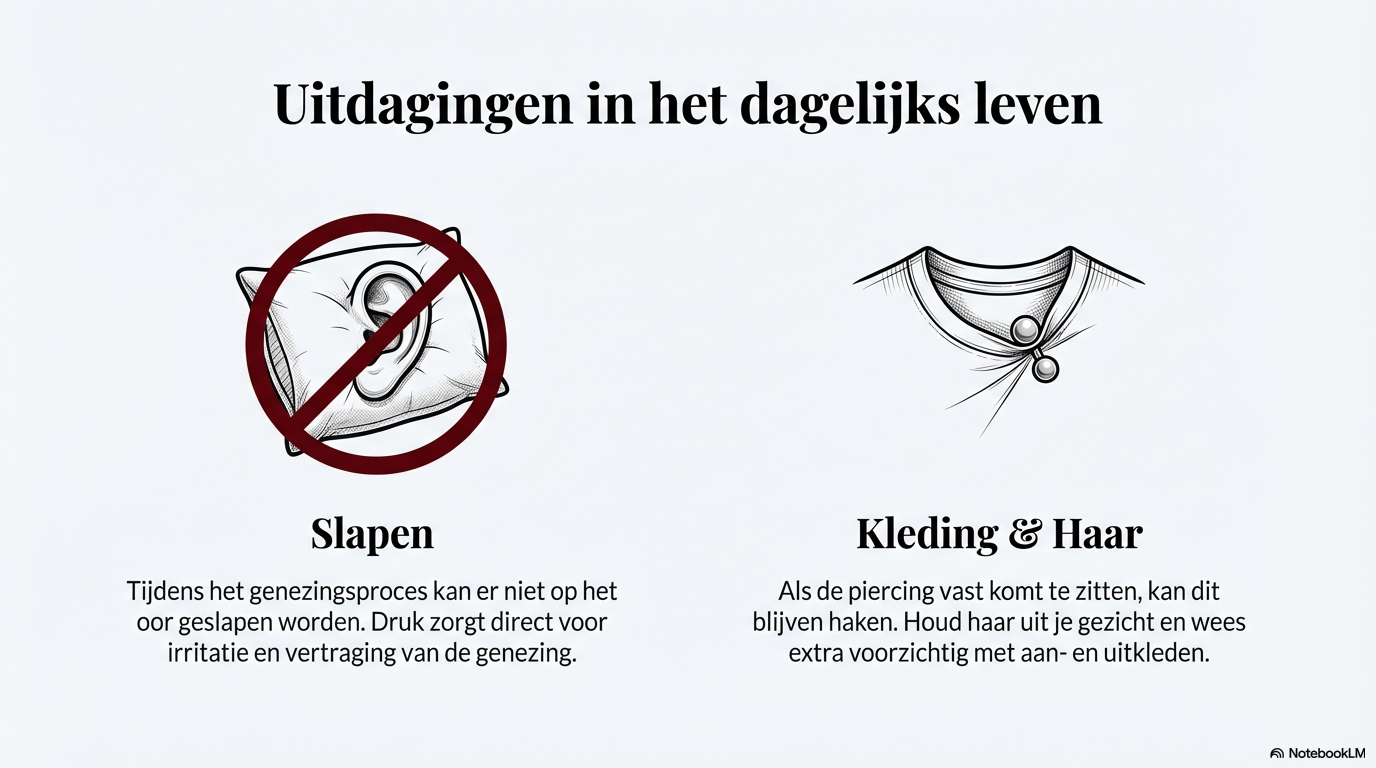 Factoren die de genezing kunnen vertragen zijn druk op het oor, slapen op de piercing, haar dat blijft haken, koptelefoons, helmen of te vroeg wisselen van sieraad. Ook kleding kan onbewust irritatie veroorzaken.