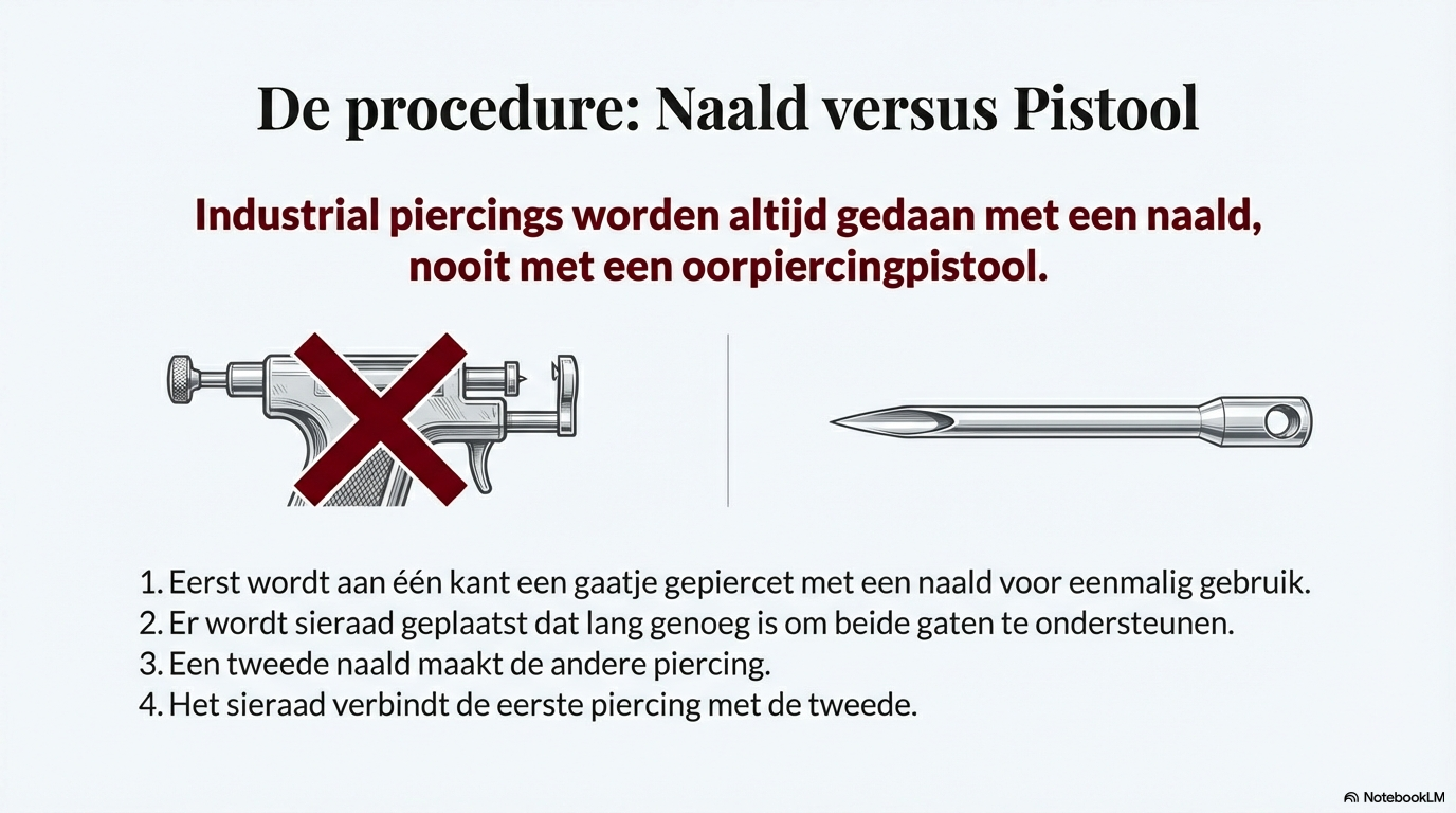 Een industrial piercing wordt altijd met een steriele naald gezet, nooit met een piercingpistool. Kraakbeen vereist precisie en controle, en alleen een naald biedt die nauwkeurigheid.