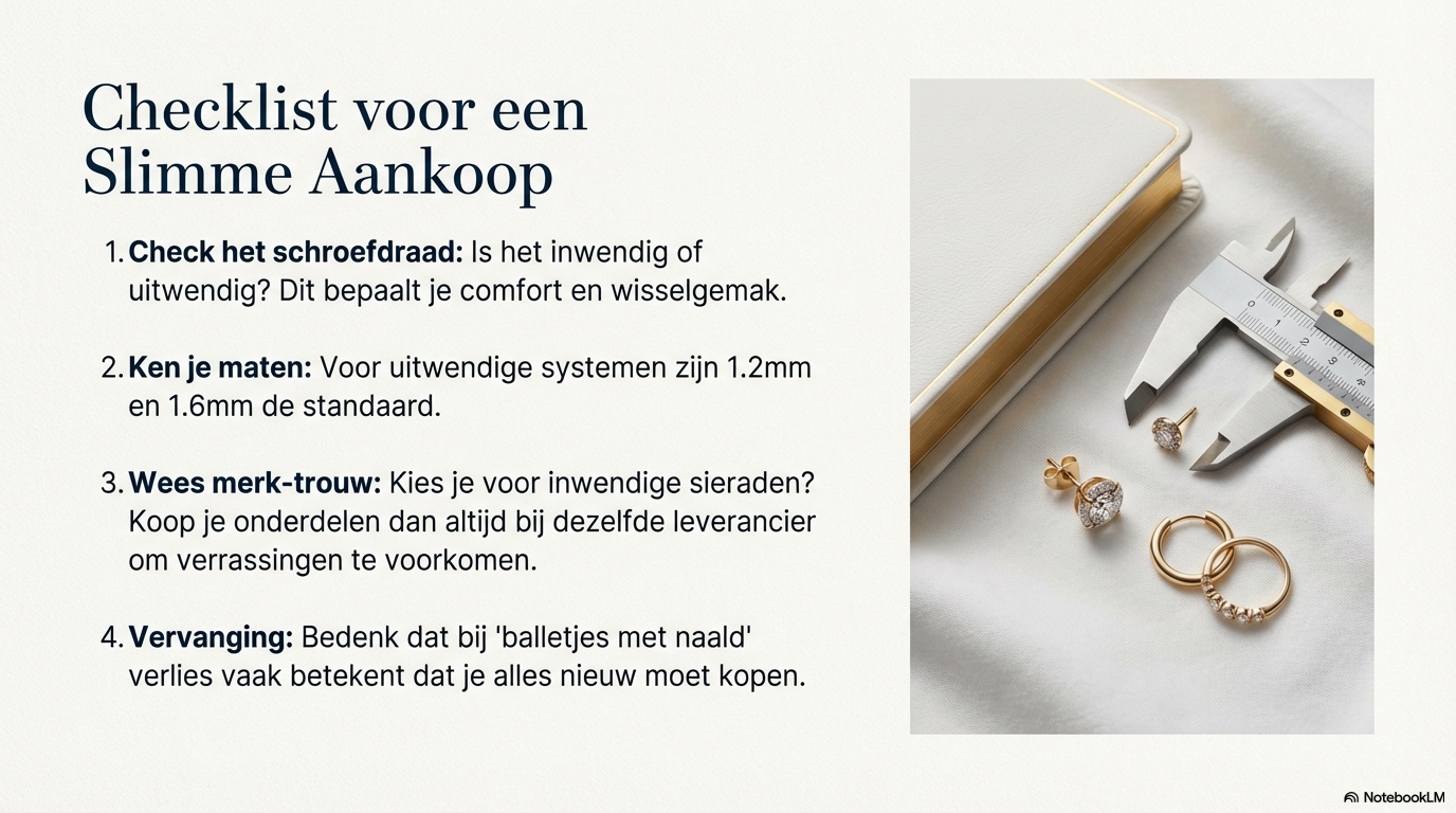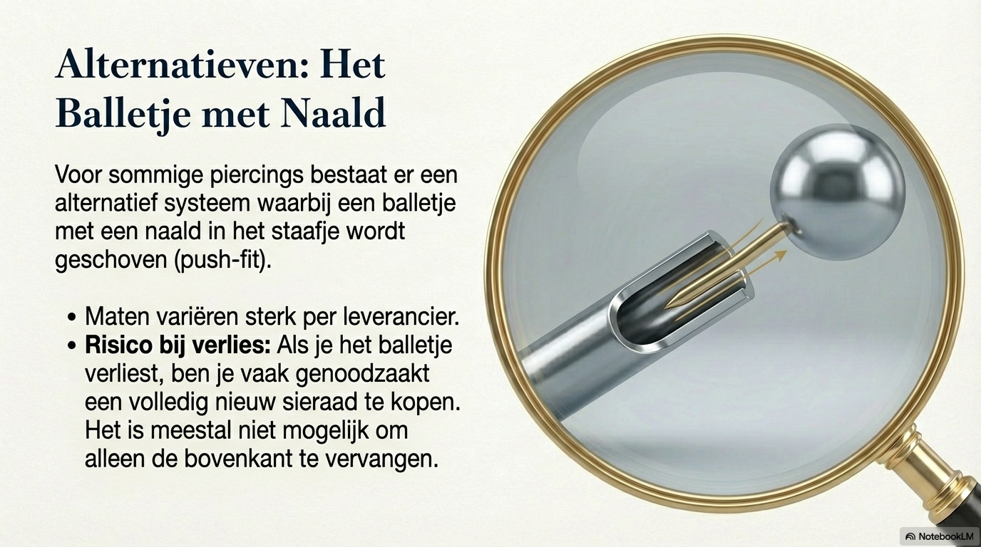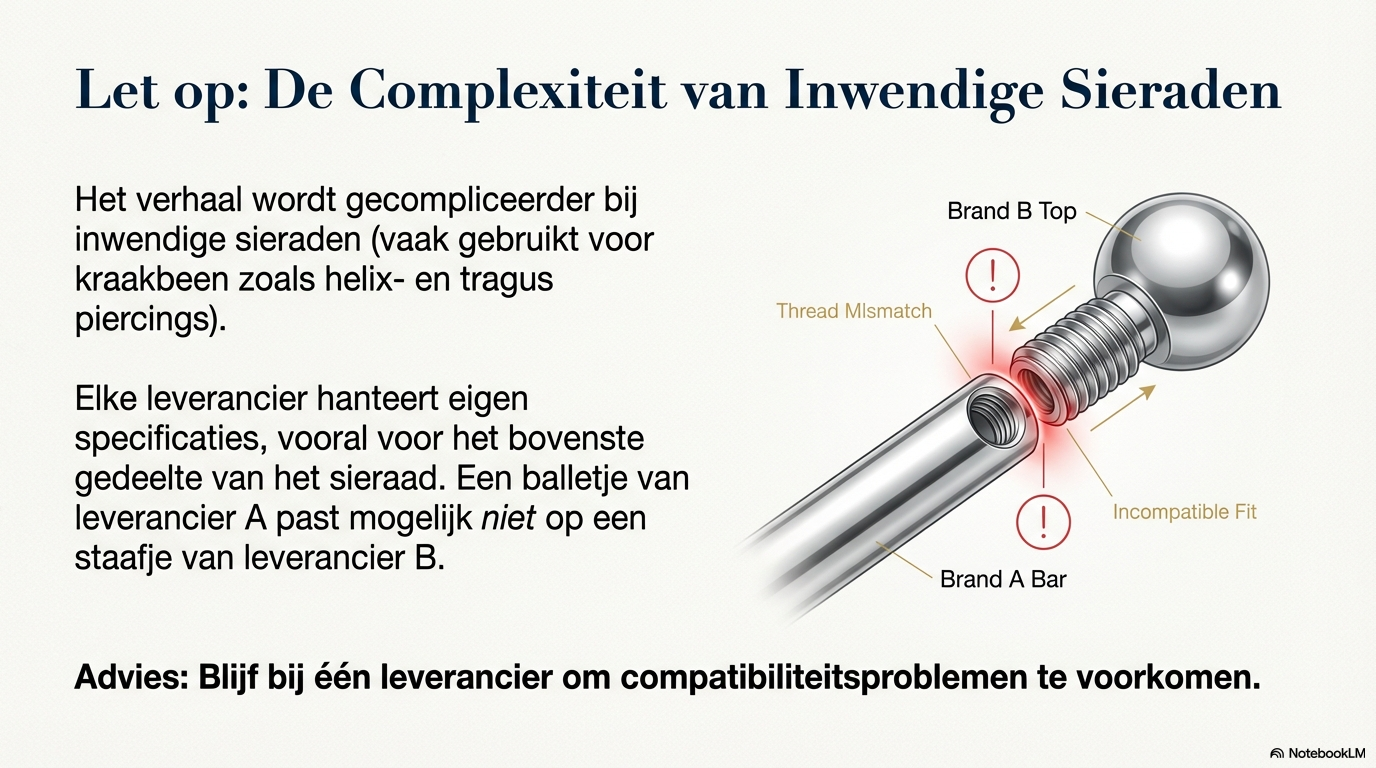 Een balletje van merk A past daardoor vaak niet op een staafje van merk B. Forceren leidt tot beschadigd schroefdraad, losdraaiende tops of een sieraad dat onveilig wordt.