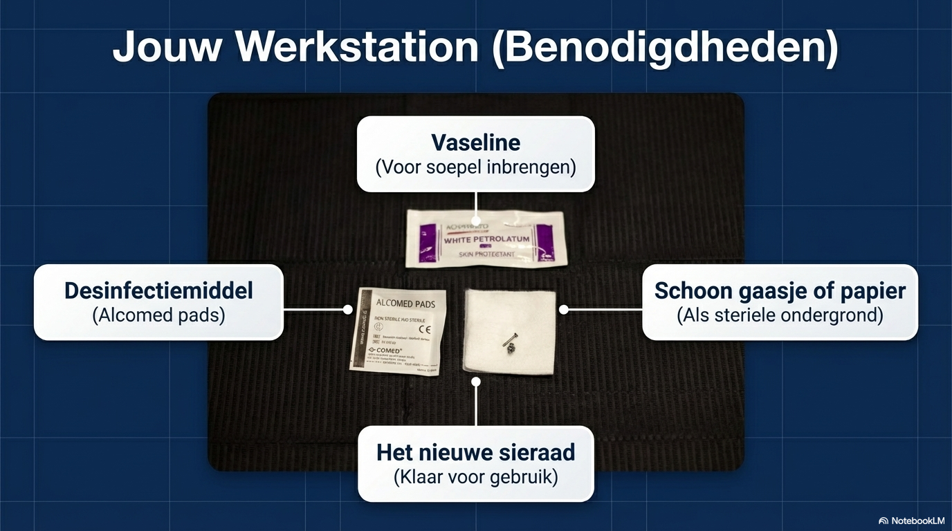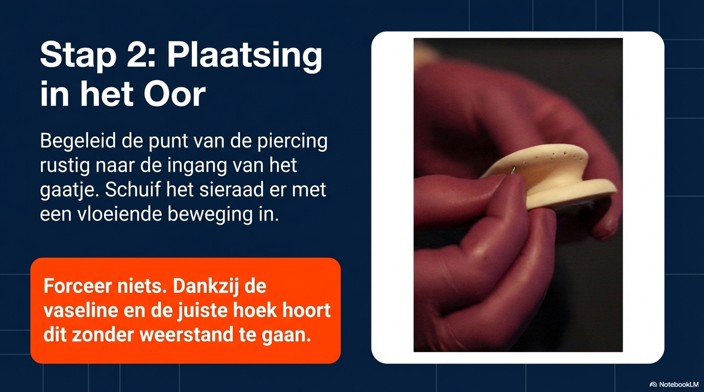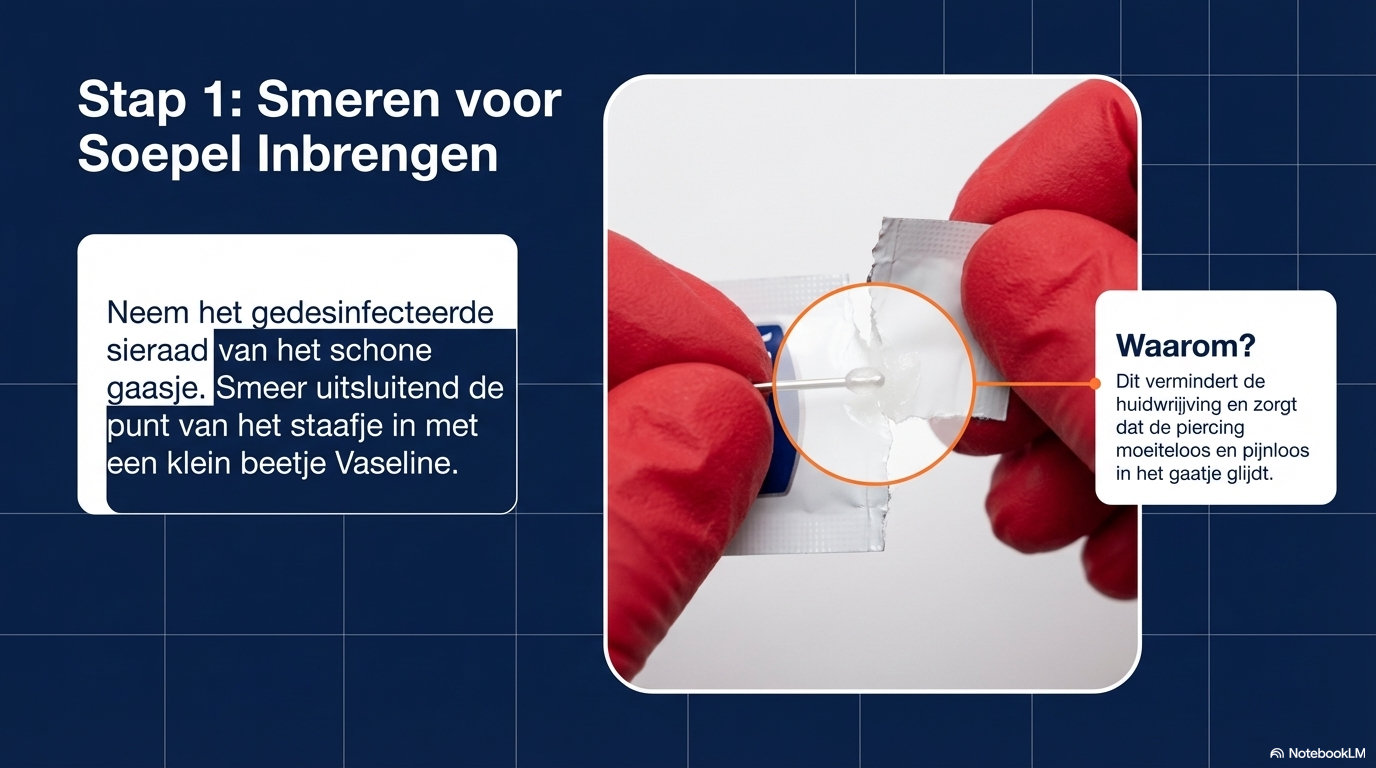 In een professionele setting wordt hiervoor bij voorkeur een steriele, eenmalige verpakking gebruikt. Dat verkleint het risico op besmetting. Het doel is niet om het sieraad “nat” te maken, maar om wrijving te verminderen. Minder weerstand betekent minder kans op irritatie en beschadiging van het huidkanaal.