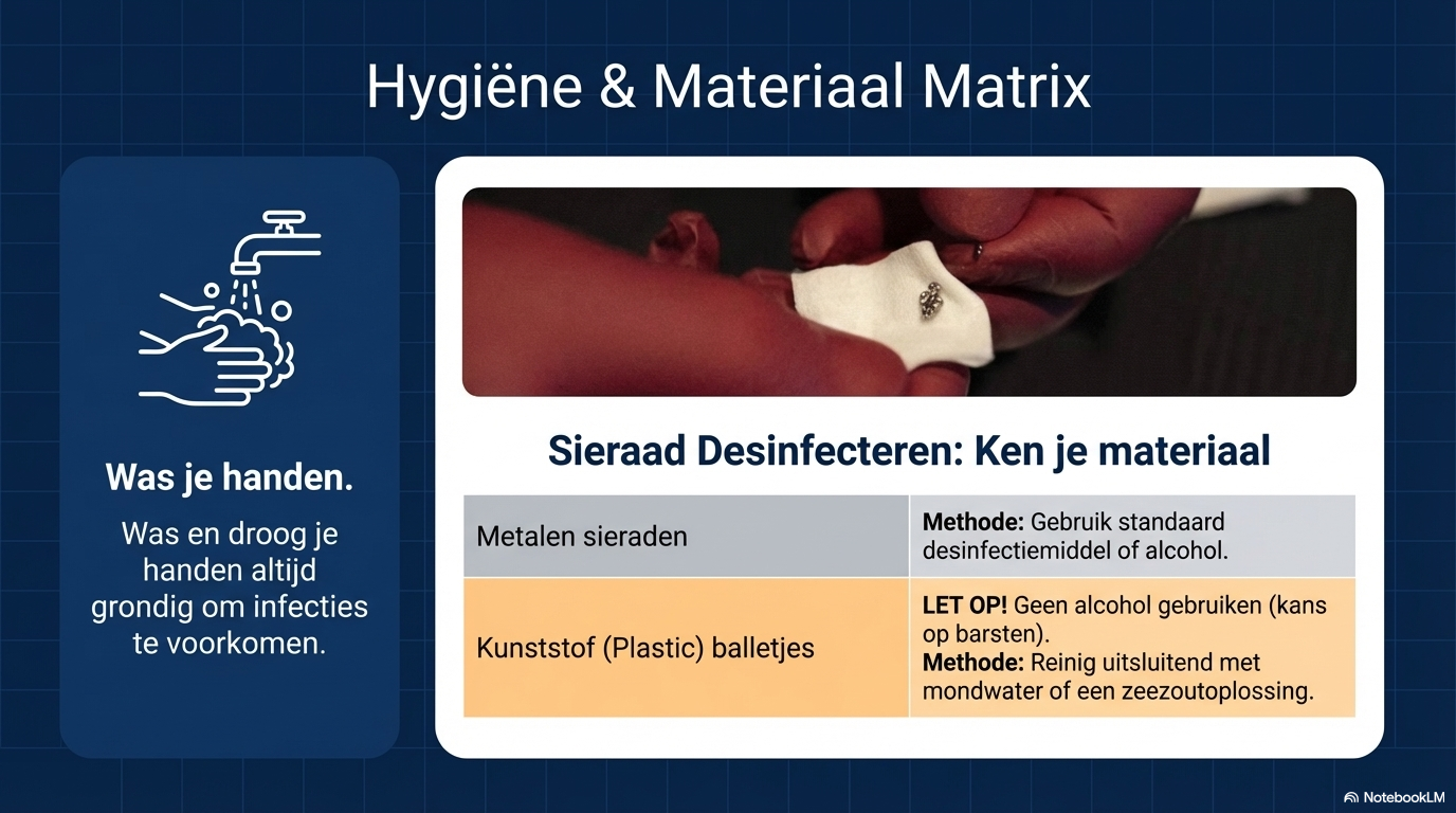 Hygiëne is essentieel, maar het juiste reinigingsmiddel hangt af van het materiaal van je sieraad. Metalen onderdelen zoals titanium, goud of chirurgisch staal kunnen doorgaans goed worden gereinigd met een alcoholdoekje. Bij kunststof onderdelen ligt dat anders. Alcohol kan kunststof uitdrogen, poreus maken of zelfs kleine barstjes veroorzaken.