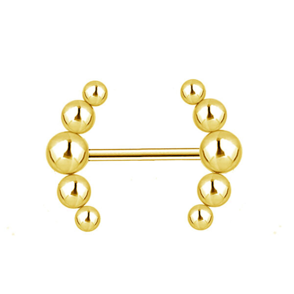 This PVD gold-coated nipple barbell embodies minimalism, crafted by expertly welding ten steel piercing balls into two elegant half-moon shapes. The design showcases that when it comes to creating piercing jewelry, less can truly be more.
