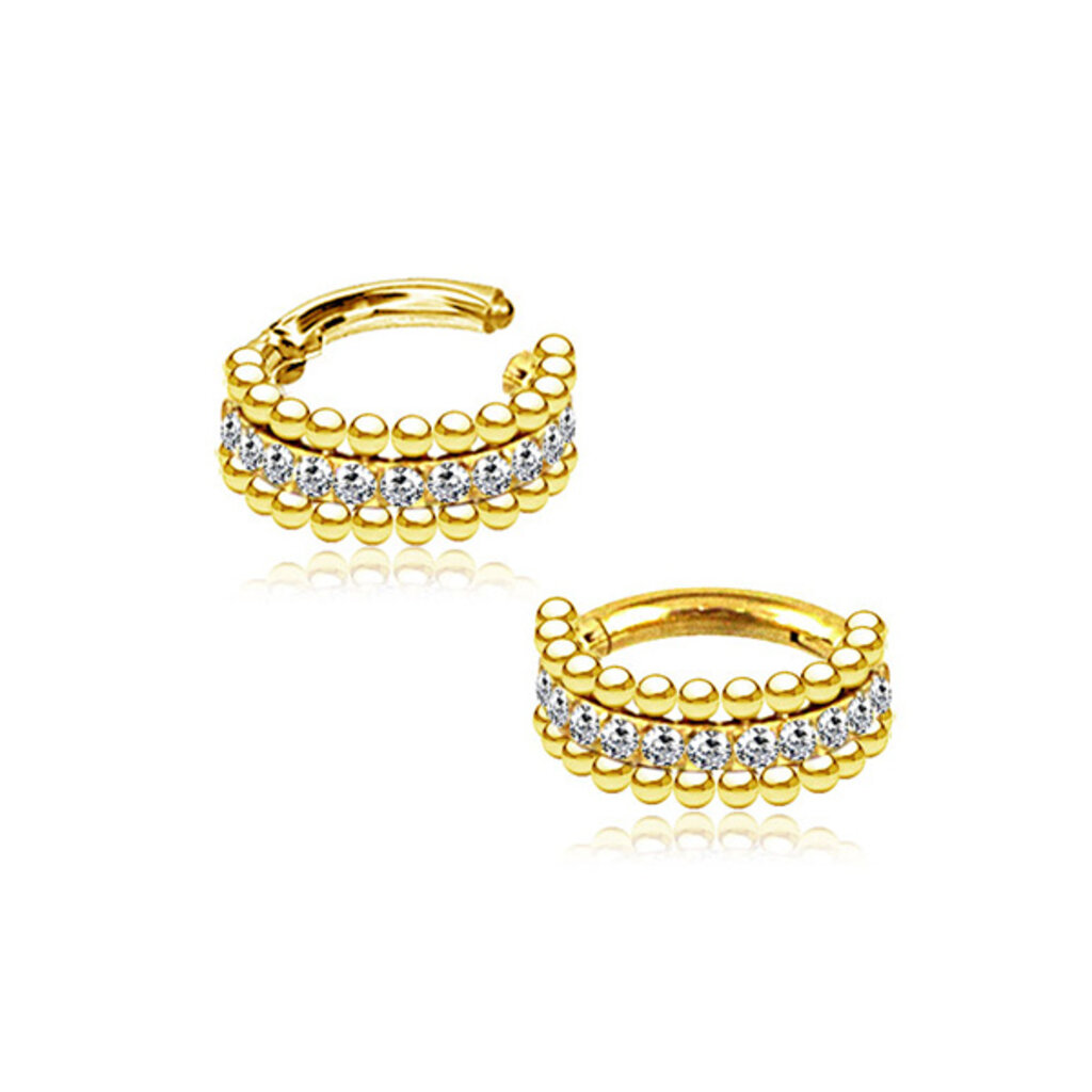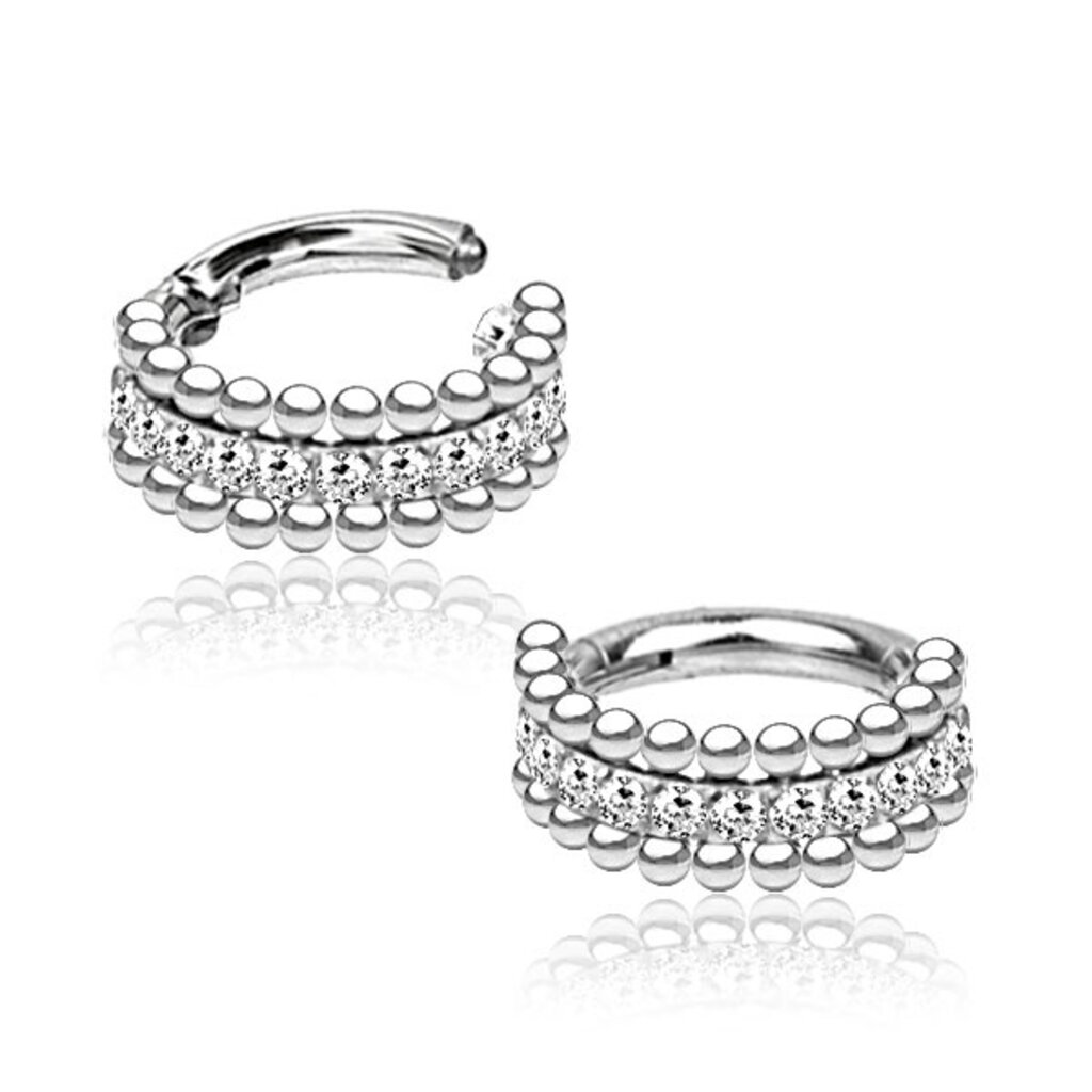 Stylish surgical steel helix piercing ring with white stones and steel balls for various ear piercings.
