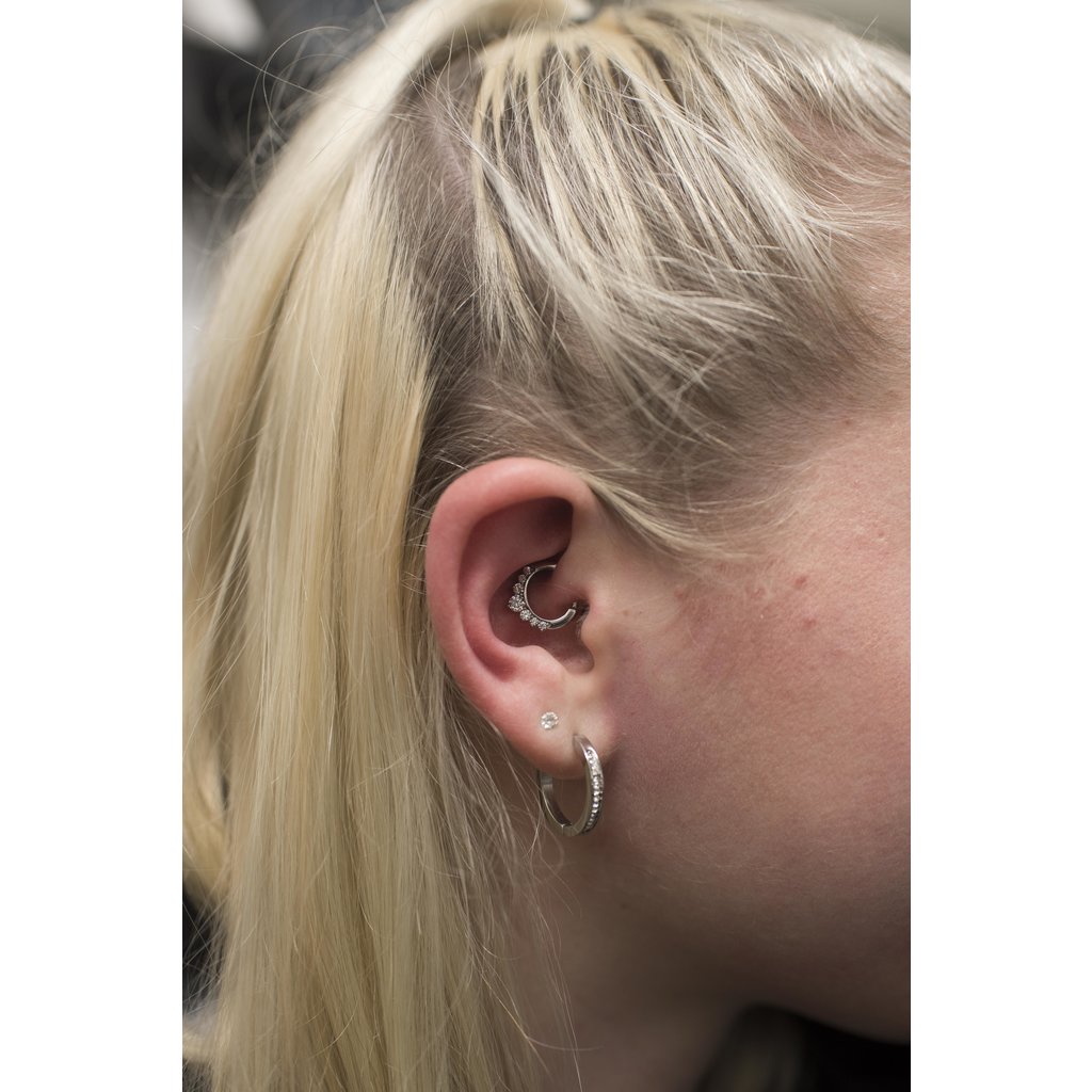 Ideal for septum but also very suitable for ear piercings! This piercing features a gorgeous design inlaid with frosty cubic zirconia crystals. The ring is easy to attach and remove due to the simple click system which is provided with a tiny hinge.