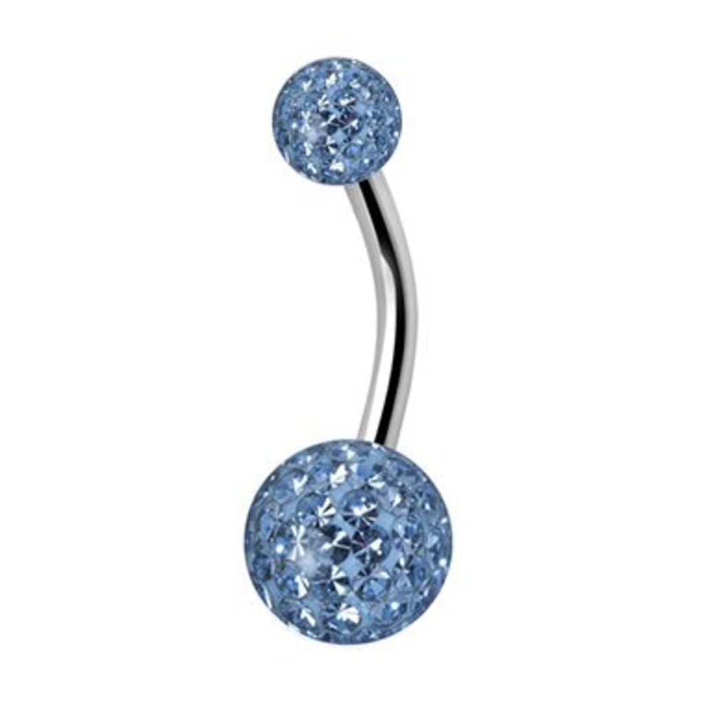 Lovely, elegant and simple! This sparkling navel piercing set with light blue premium zirconia will go beautifully with every bikini. This piece has a banana barbell with a thickness of 1,6mm and the length of 10mm. The balls have diameters of: 5mm and 8mm. Furthermore, this piece is provided with a screw-on ball, which is also inlaid with premium zirconia.