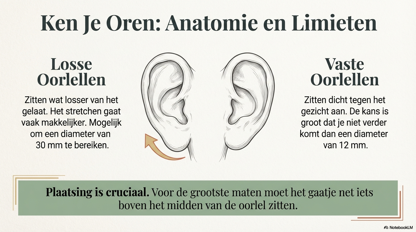 Het is erg van belang waar het gaatje van je oorbel gezet is als je deze wilt stretchen. Het gaatje moet net iets boven het midden van je oorlel zitten als je van plan bent de grootste maten te bereiken.