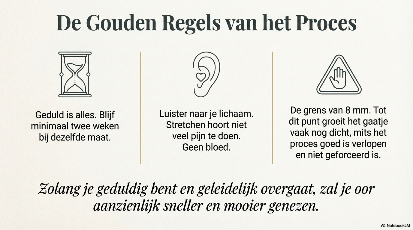 Hierbij is het erg belangrijk dat je goed oplet, naar je lichaam luistert en geduldig blijft. Vaak kan een piercing-gaatje nog dicht groeien als je deze niet verder oprekt dan 8 mm, maar dit hangt er echt vanaf of het stretch-proces goed is verlopen en dat het gaatje dus niet geforceerd is.