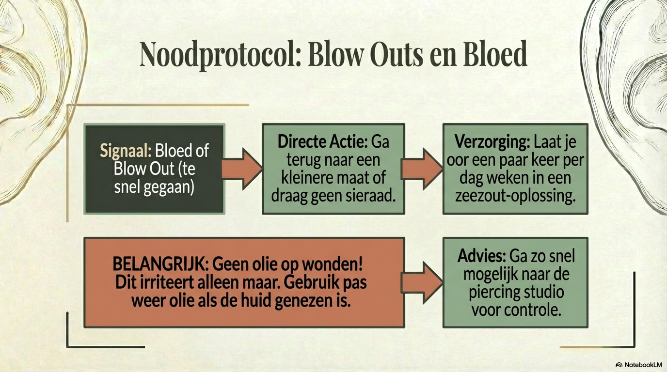 24. Het beste wat je zelf kunt doen als je een blow out hebt is terug gaan naar een kleinere maat en dus kleiner sieraad dragen. In veel gevallen is het verstandig om zelfs even helemaal geen sieraad te dragen. Laat je oor een paar keer per dag weken in een oplossing van zeezout. Ga niet met olie aan de slag, dit zal alleen maar meer irriteren. Oliën kun je pas gebruiken wanneer je oor genezen is.