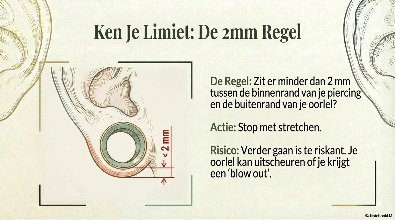 22. Veel mensen vragen zich af tot welke maat ze kunnen stretchen. Dit verschilt echter per persoon. Wanneer er minder dan 2 mm tussen de binnenrand van je piercing-gaatje en de buitenrand van je oorlel zit is het niet aan te raden om verder te stretchen. Dit is té riskant en kan er voor zorgen dat je oorlel uitscheurt of dat je een blow out krijgt.