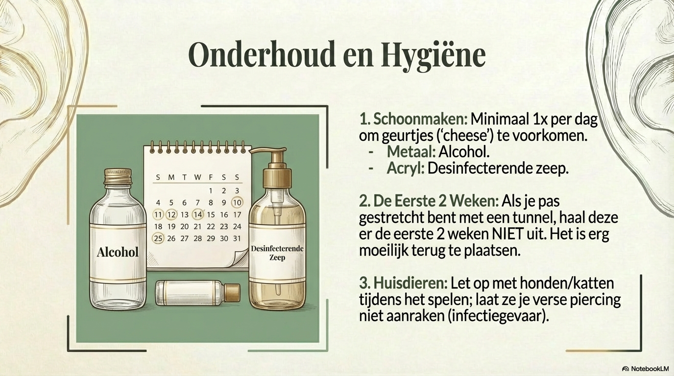 13. Op de vraag “Hoe vaak moet ik mijn tunnel/stretcher schoonmaken?” is ons advies: minimaal 1 keer per dag om onaangename geurtjes te voorkomen. Let op: als je piercing pas gestretcht is met een tunnel, haal dan de eerste 2 weken de tunnel er niet uit, want het kan erg moeilijk zijn om hem er weer in te krijgen.