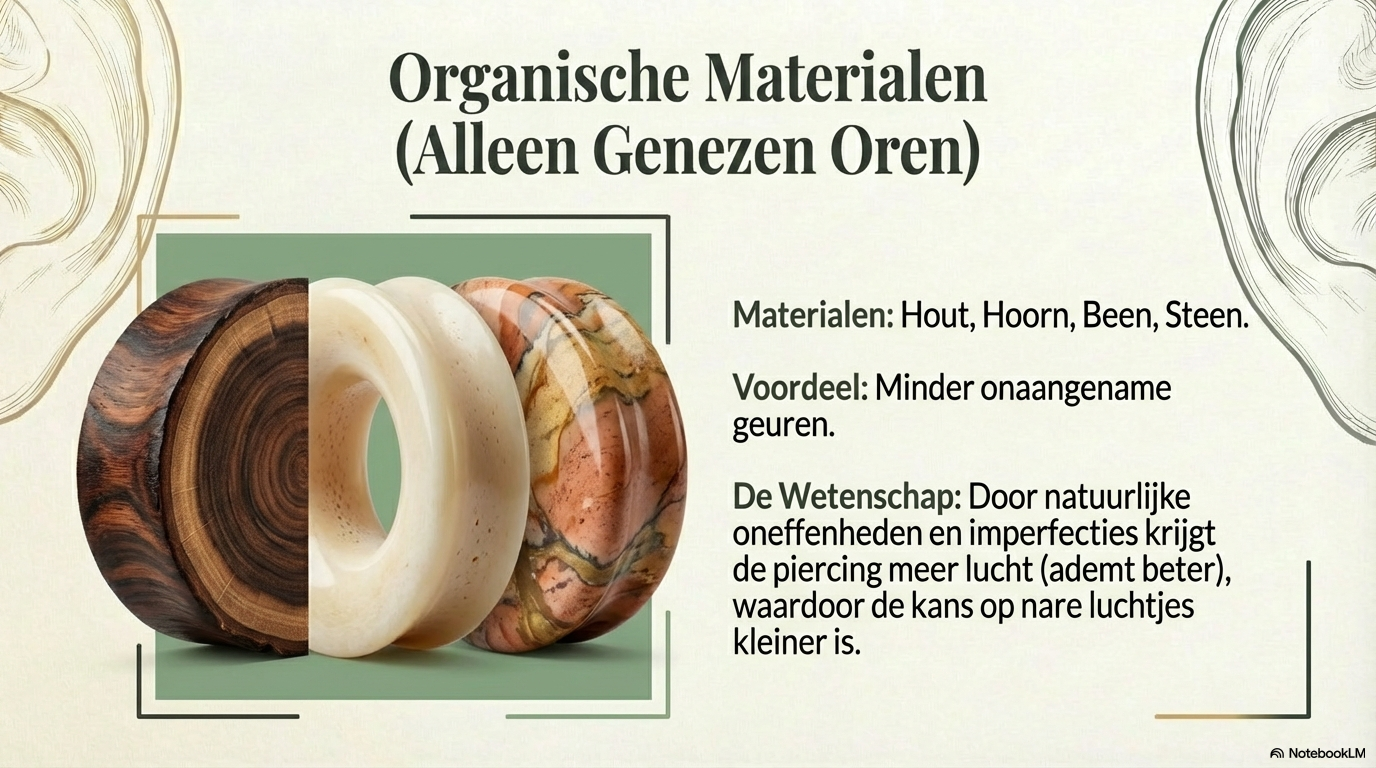 20. Sieraden van natuurlijke materialen (hout, hoorn, been, steen) zullen beslist minder onaangename geuren veroorzaken vanwege de natuurlijke oneffenheden in de rand. Door deze kleine imperfecties krijgt de piercing meer lucht waardoor er een kleinere kans ontstaat op nare luchtjes.