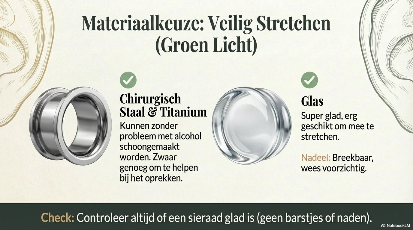 15. De beste materialen voor bij het stretchen met tunnels, zijn chirurgisch staal of titanium. Wat je ook vaak ziet zijn tunnels van acryl, welke prima zijn als je op de zelfde maat wilt blijven. Het nadeel van acryl echter is dat ze niet zwaar genoeg zijn om je piercing verder mee op te rekken. Ook gaat de achterkant soms kapot wanneer je ze met alcohol schoon maakt. Chirurgisch staal en titanium kunnen zonder probleem schoon gemaakt worden met alcohol.