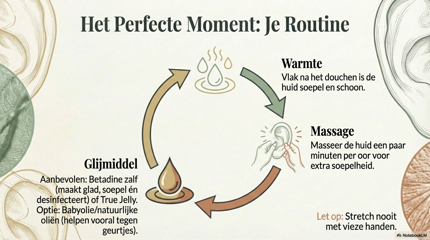 9. Het beste moment om te stretchen is vlak na het douchen, wanneer je huid soepel en schoon is. Masseer de huid voor het stretchen een paar minuten per oor zodat deze extra soepel zijn tijdens het oprekken van je gaatje.