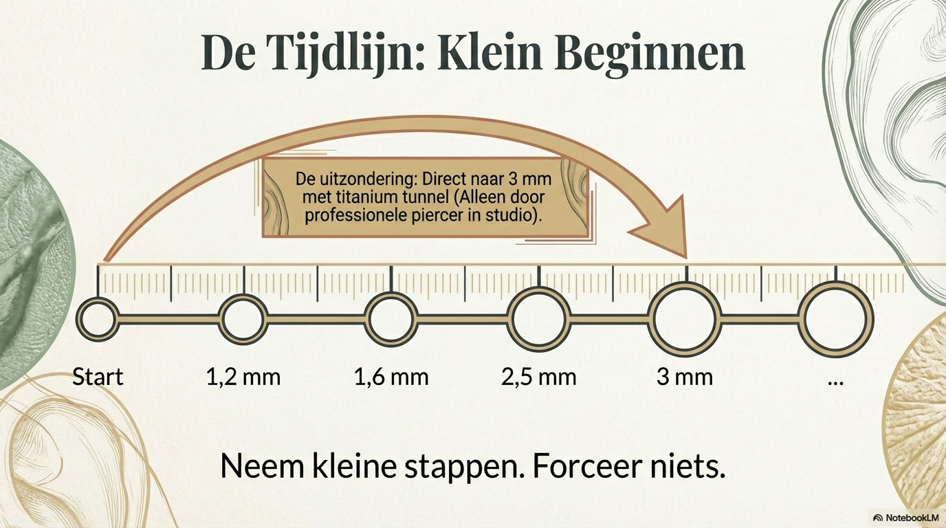 3. In de meeste gevallen kan het gaatje direct naar 3 mm gestretcht worden met een titanium tunnel. Hiervoor moet je echter wel naar een professionele studio gaan aangezien dit enkel door een ervaren piercer gedaan kan worden.