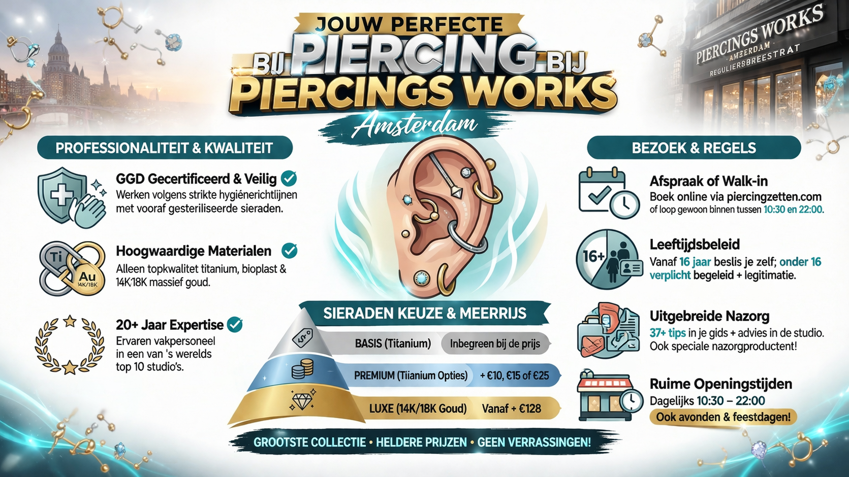 Piercings Works bewijst dat de drempel voor hoogwaardige body art verlaagd kan worden door transparantie, efficiëntie en ongekende beschikbaarheid, zonder ooit in te leveren op de medische standaarden die bij een top 10-notering horen. Het is niet langer alleen het zetten van een gaatje; het is een curated lifestyle-ervaring in het hart van Amsterdam.
