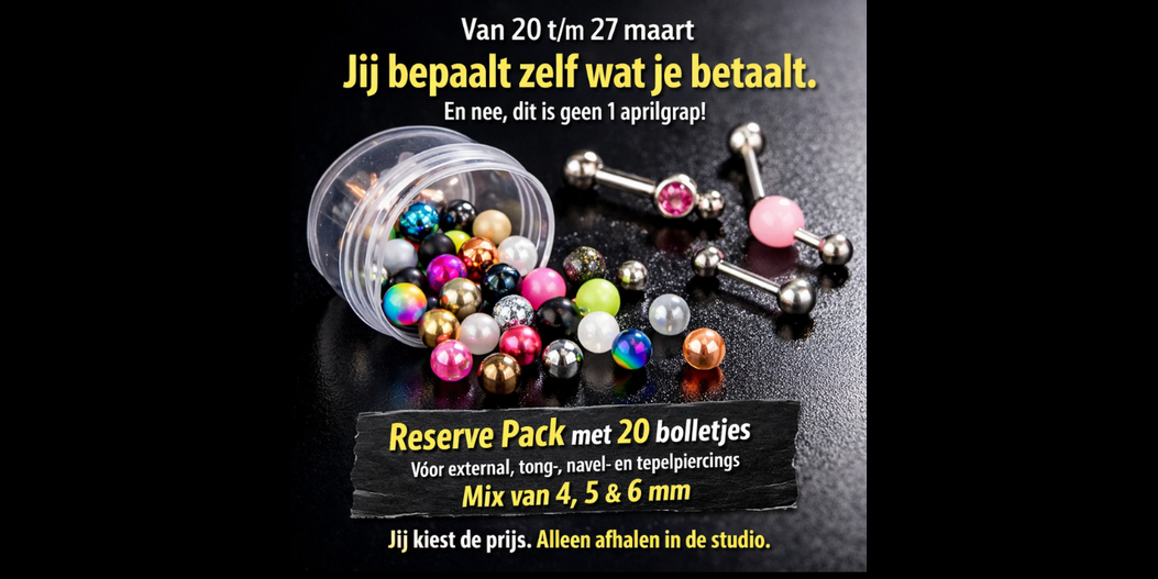 Van 20 t/m 27 maart 2026 kun je bij Piercings Works een Reserve Pack met 20 bolletjes meenemen waarbij jij zelf bepaalt wat je betaalt.