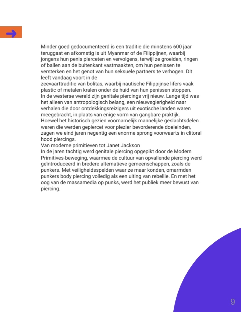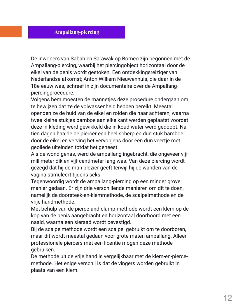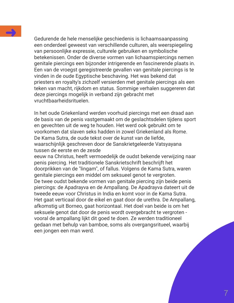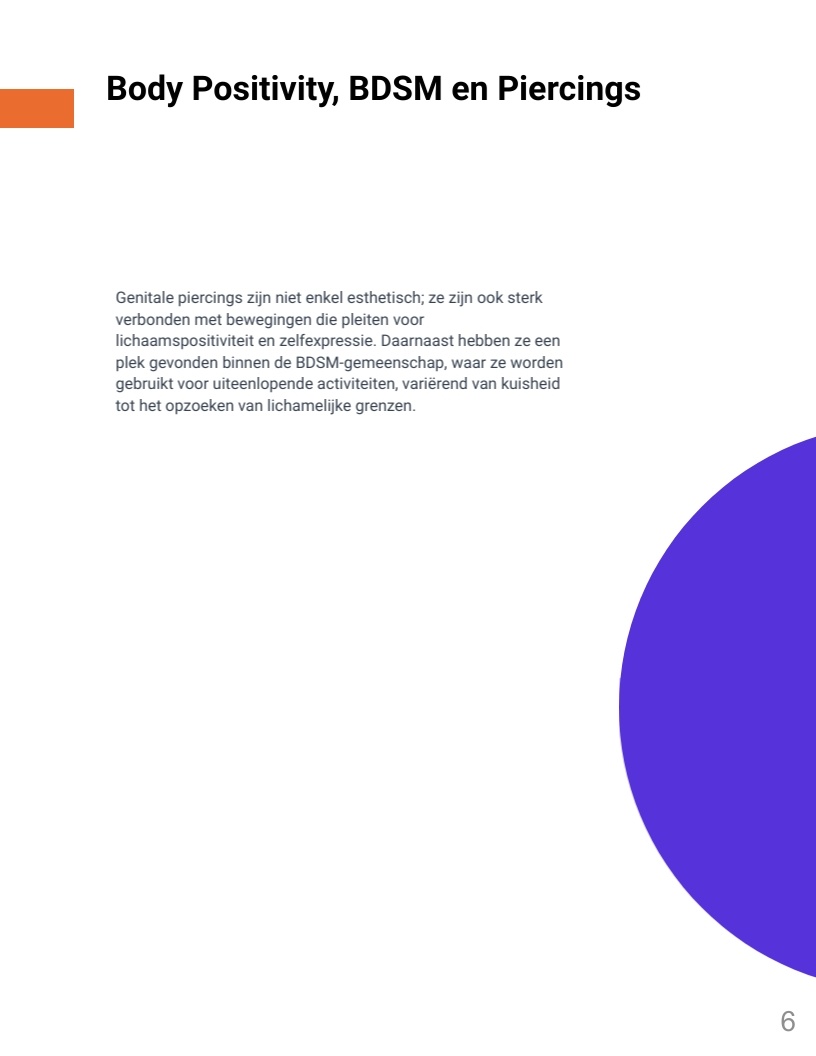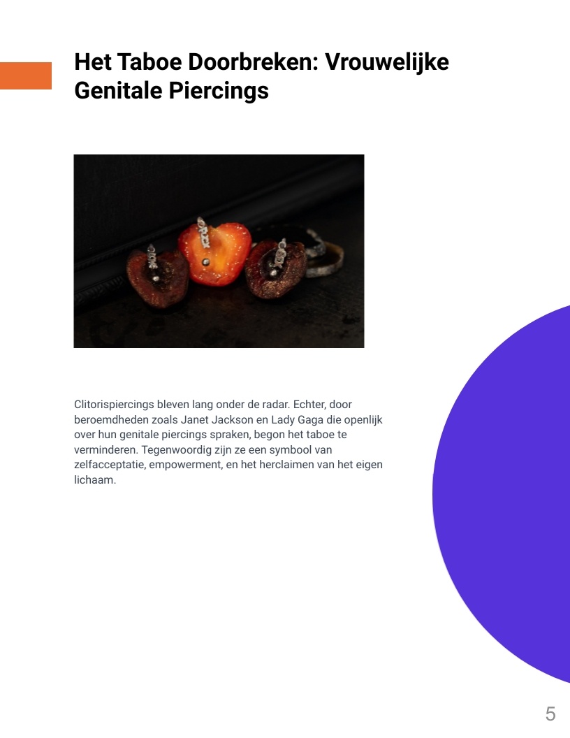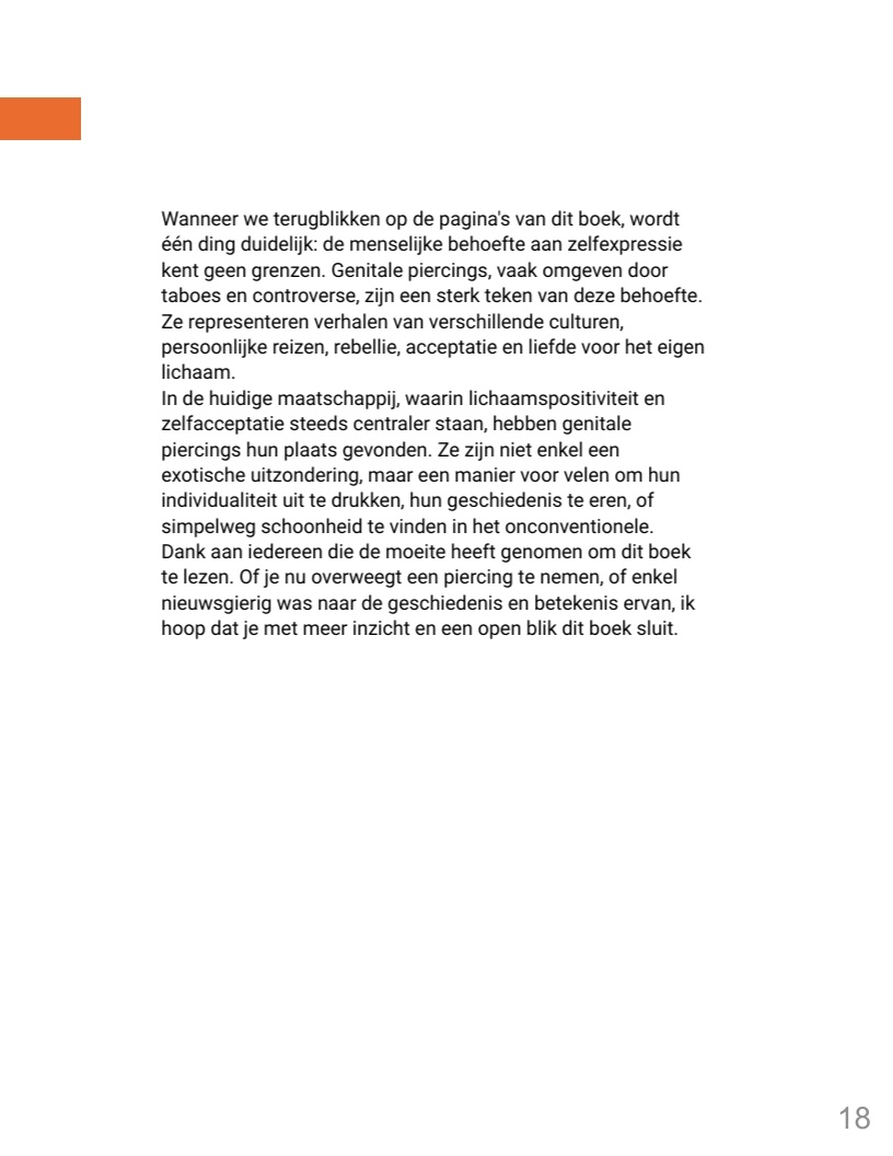 Genitale piercings zijn een vorm van zelfexpressie en vertegenwoordigen verhalen van diverse culturen, persoonlijke ervaringen en zelfacceptatie. In een wereld waar lichaamspositiviteit belangrijk is, hebben deze piercings een plek gevonden als uitdrukking van individualiteit en schoonheid. Dit boek biedt inzicht in de geschiedenis en betekenis van genitale piercings en moedigt lezers aan met een open blik naar dit onderwerp te kijken.