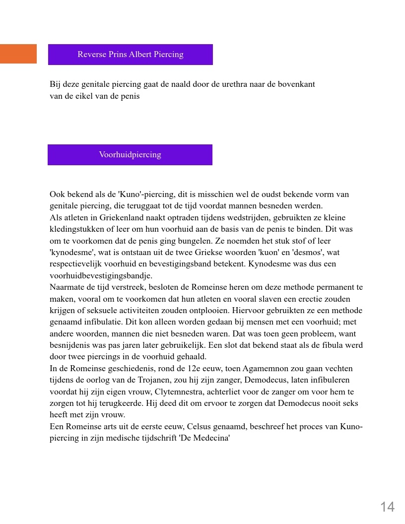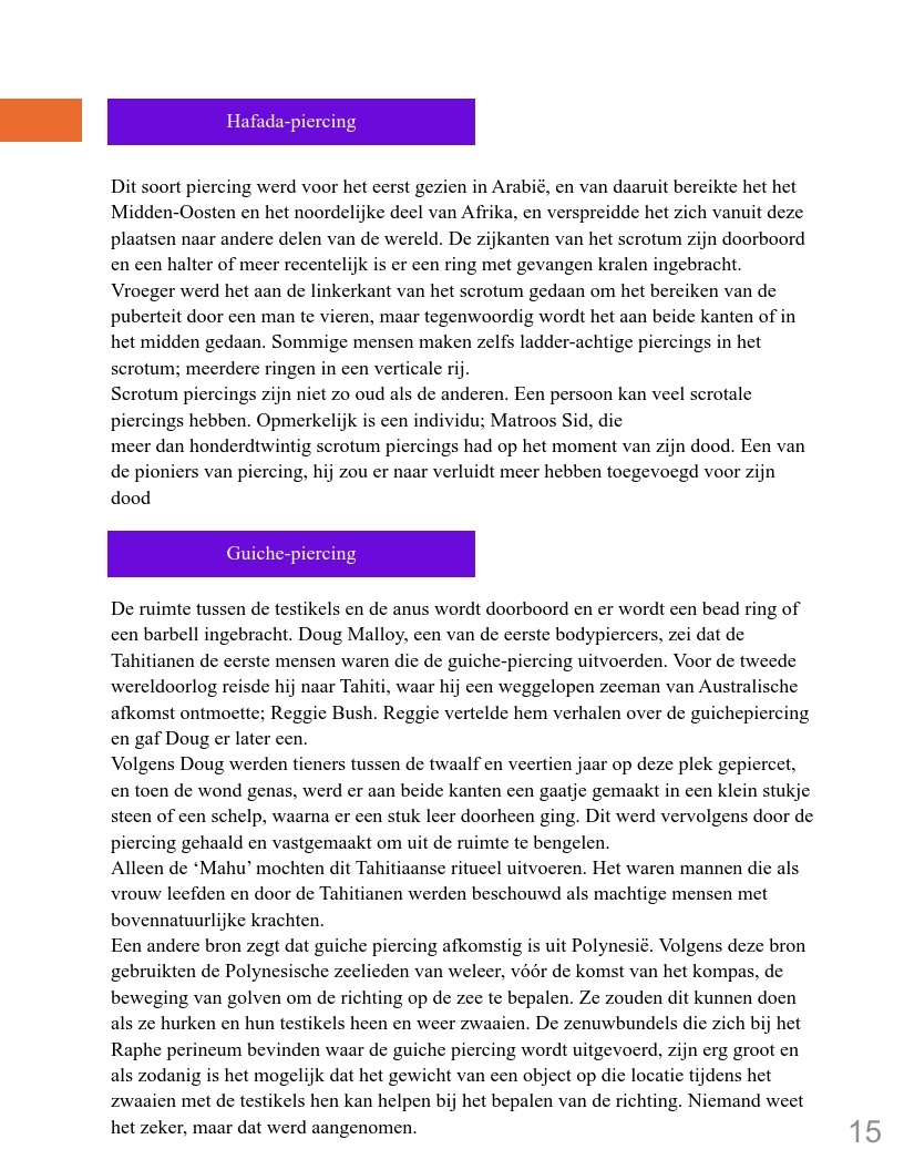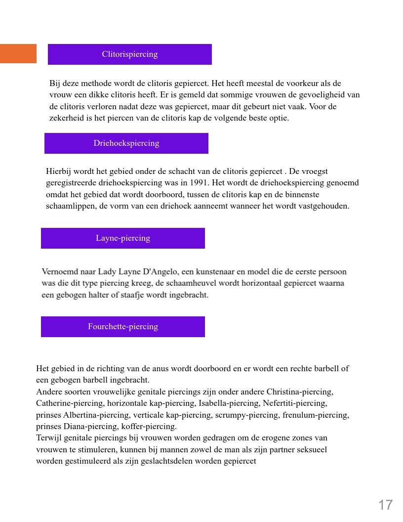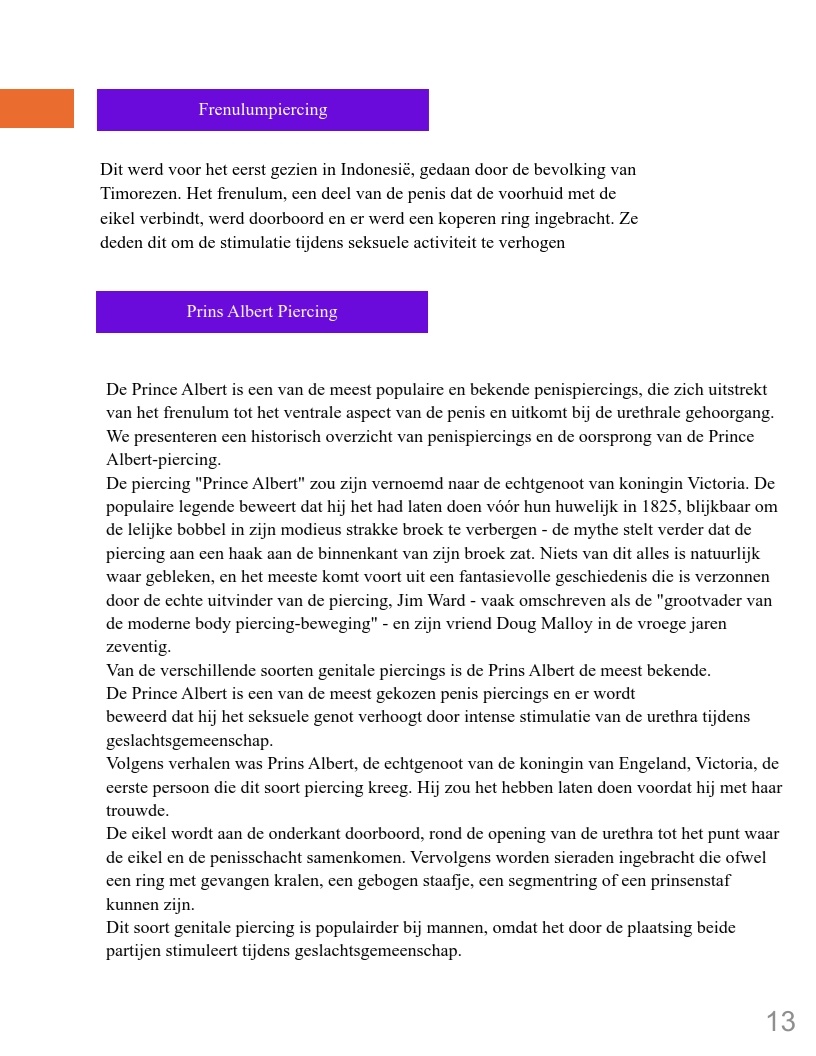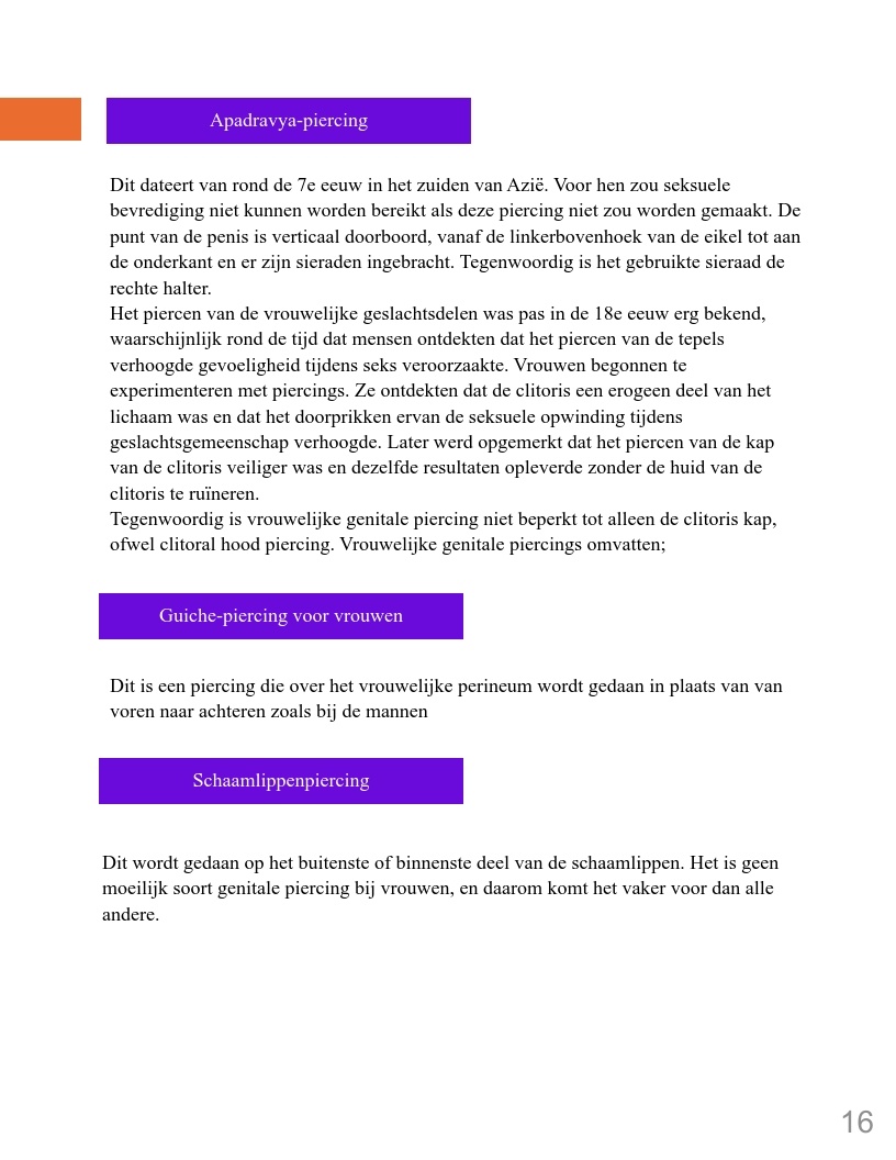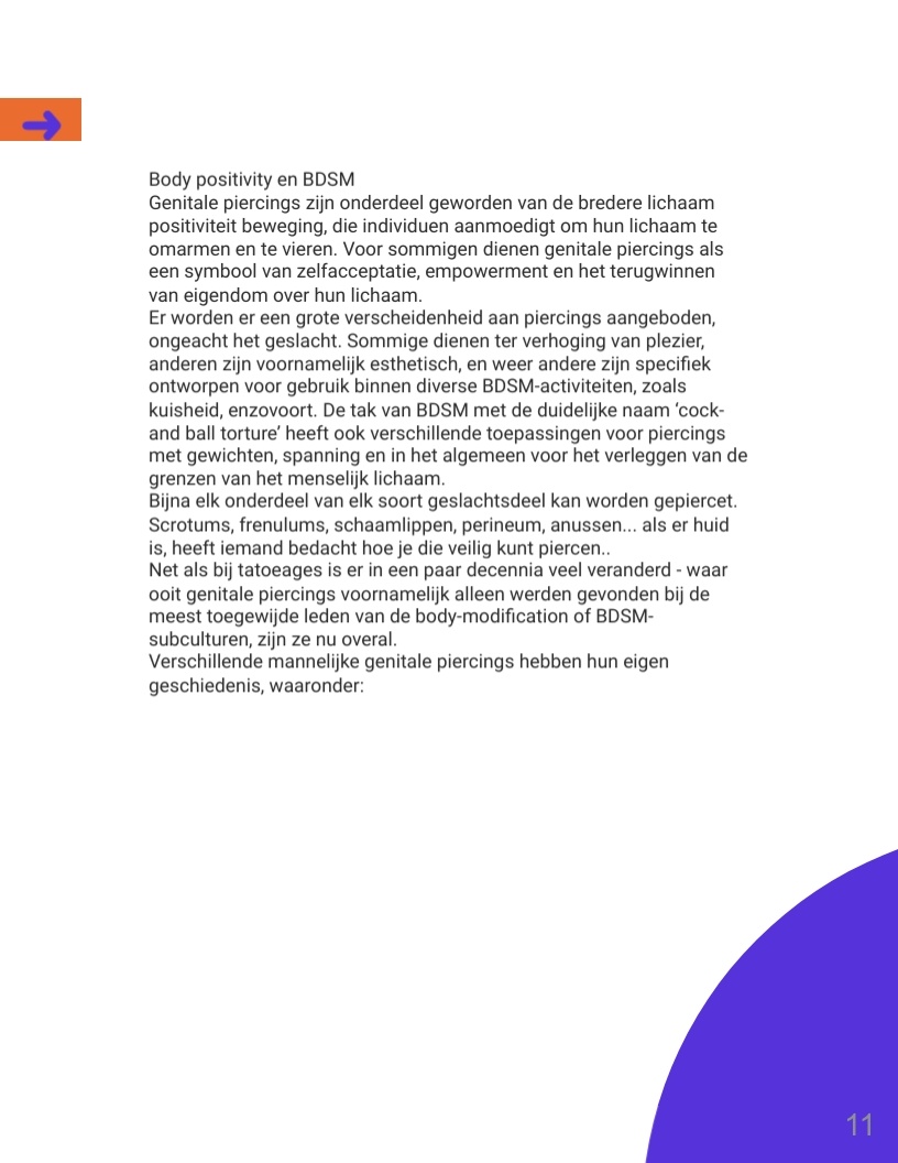 Genitale piercings zijn een vorm van zelfexpressie en vertegenwoordigen verhalen van diverse culturen, persoonlijke ervaringen en zelfacceptatie. In een wereld waar lichaamspositiviteit belangrijk is, hebben deze piercings een plek gevonden als uitdrukking van individualiteit en schoonheid. Dit boek biedt inzicht in de geschiedenis en betekenis van genitale piercings en moedigt lezers aan met een open blik naar dit onderwerp te kijken.