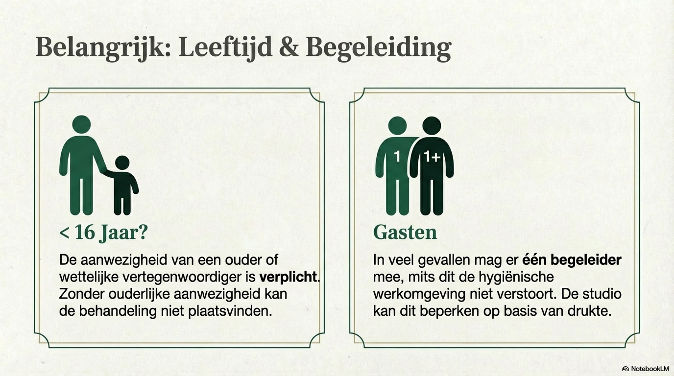Bij jongeren onder de 16 jaar is de aanwezigheid van één van de ouders of wettelijke vertegenwoordiger verplicht.