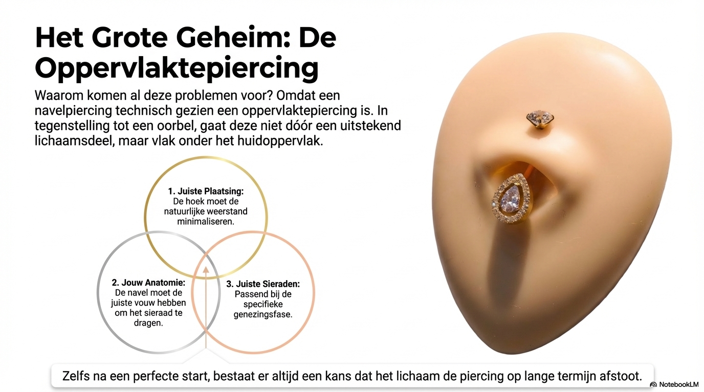 Een navelpiercing is technisch gezien een oppervlaktepiercing.