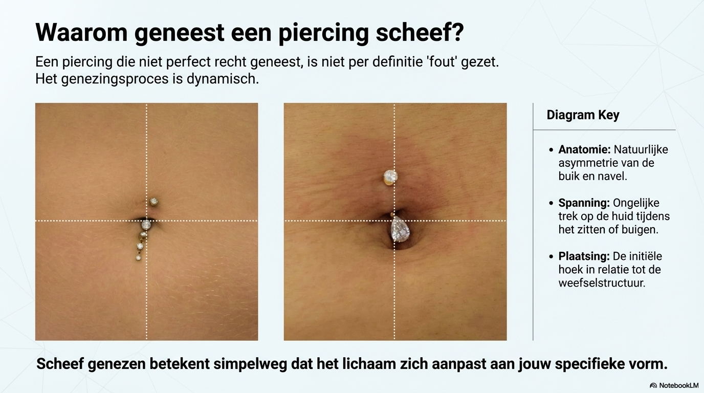 Ja, een piercing kan scheef genezen door: