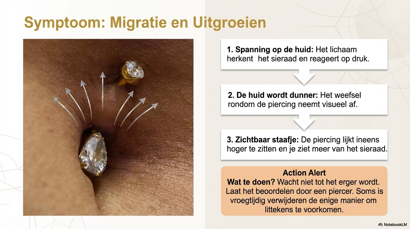 Uitgroeien, ook wel migratie genoemd, gebeurt wanneer het lichaam het sieraad langzaam naar buiten duwt.