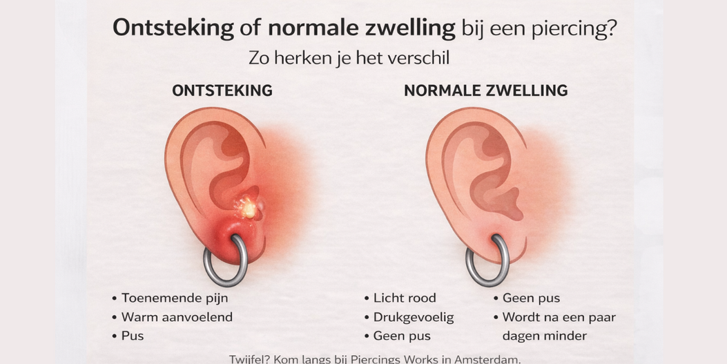 Zwelling is een normaal onderdeel van het genezingsproces, vooral in de eerste weken na het zetten van een piercing. Maar wanneer zwelling omslaat in pijn, pus en roodheid die toeneemt, is er mogelijk sprake van een ontsteking.