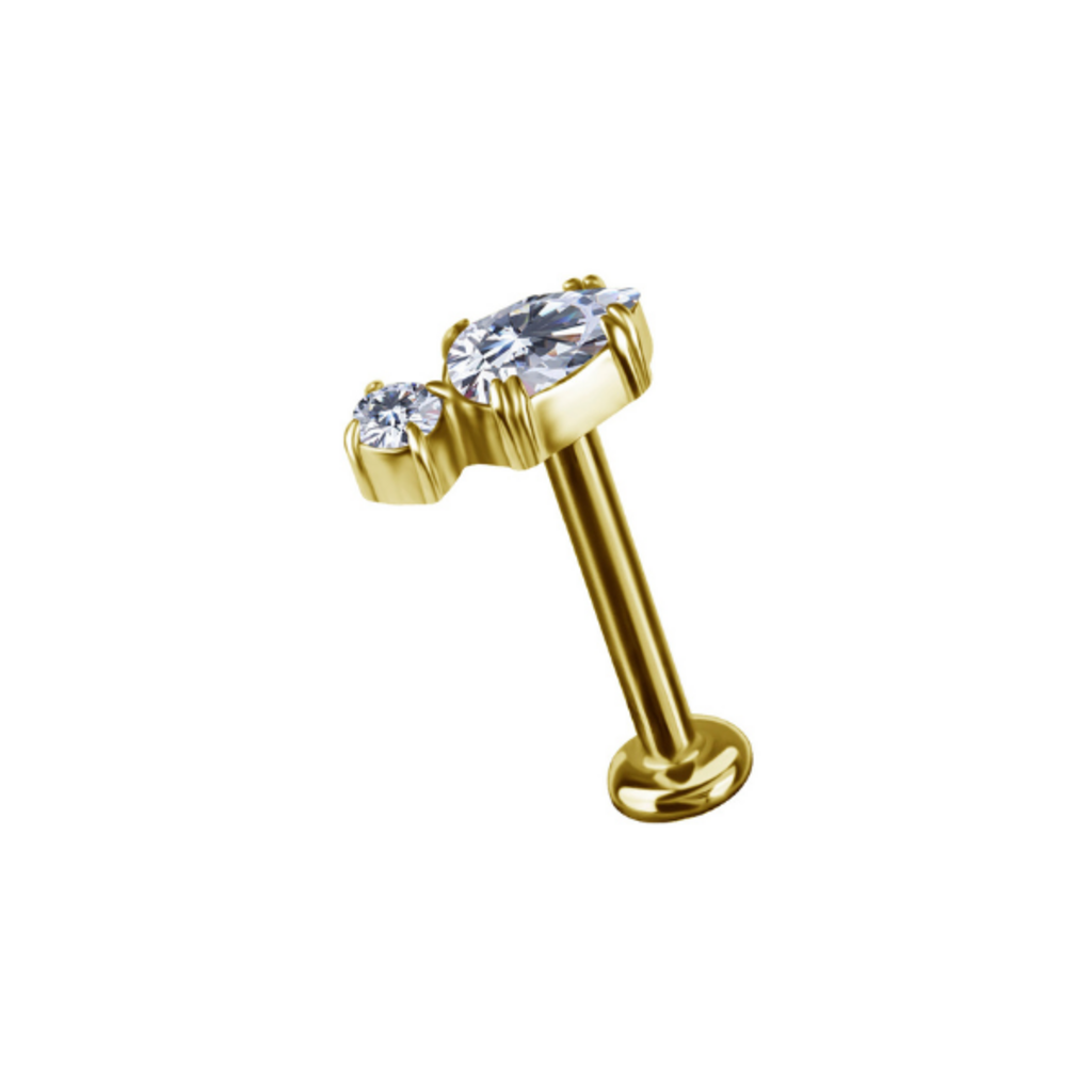 Golden Duo Pear is een tragus en helix piercing waarin contrast en elegantie samenkomen. De peervormige centrale steen creëert een zachte, verlengde vorm, terwijl de kleinere ronde Premium Cubic Zirconia zorgt voor balans en verfijning.