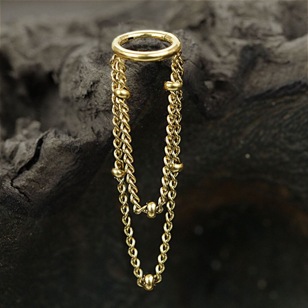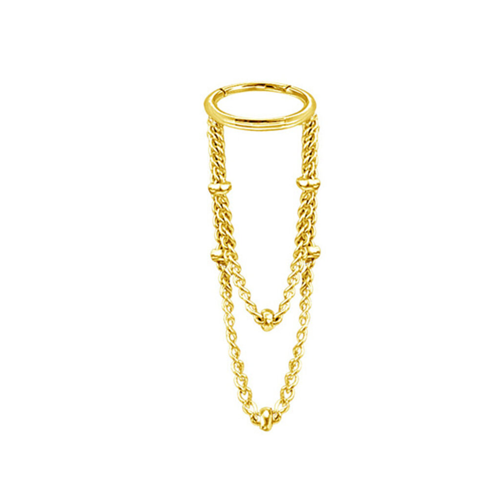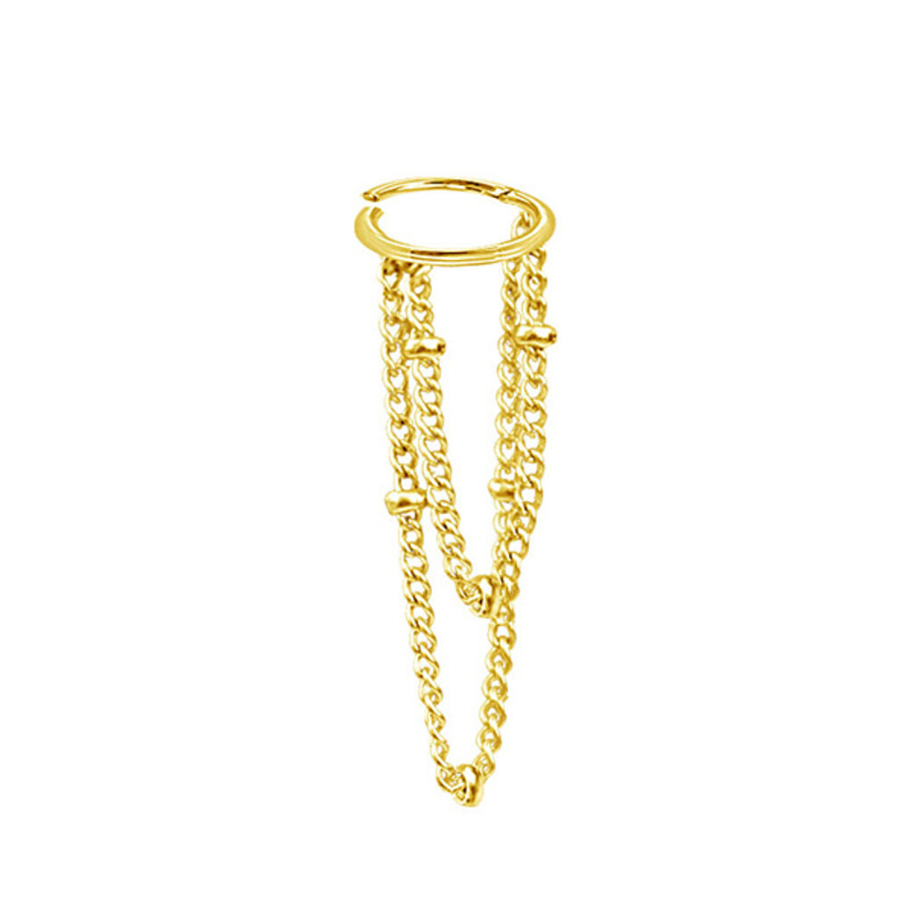 Maak kennis met onze prachtige PVD-vergulde helix piercing, versierd met kettingen. De basis van deze adembenemende stalen piercing is een scharnierende segmentring, waar we twee stalen kettingen aan de zijkant aan lassen. Perfect als oorpiercing voor de zijkant van het oor, voegt deze piercing een vleugje elegantie en stijl toe aan je look.