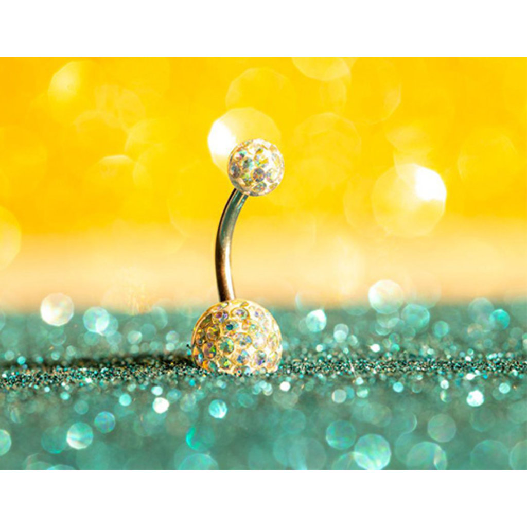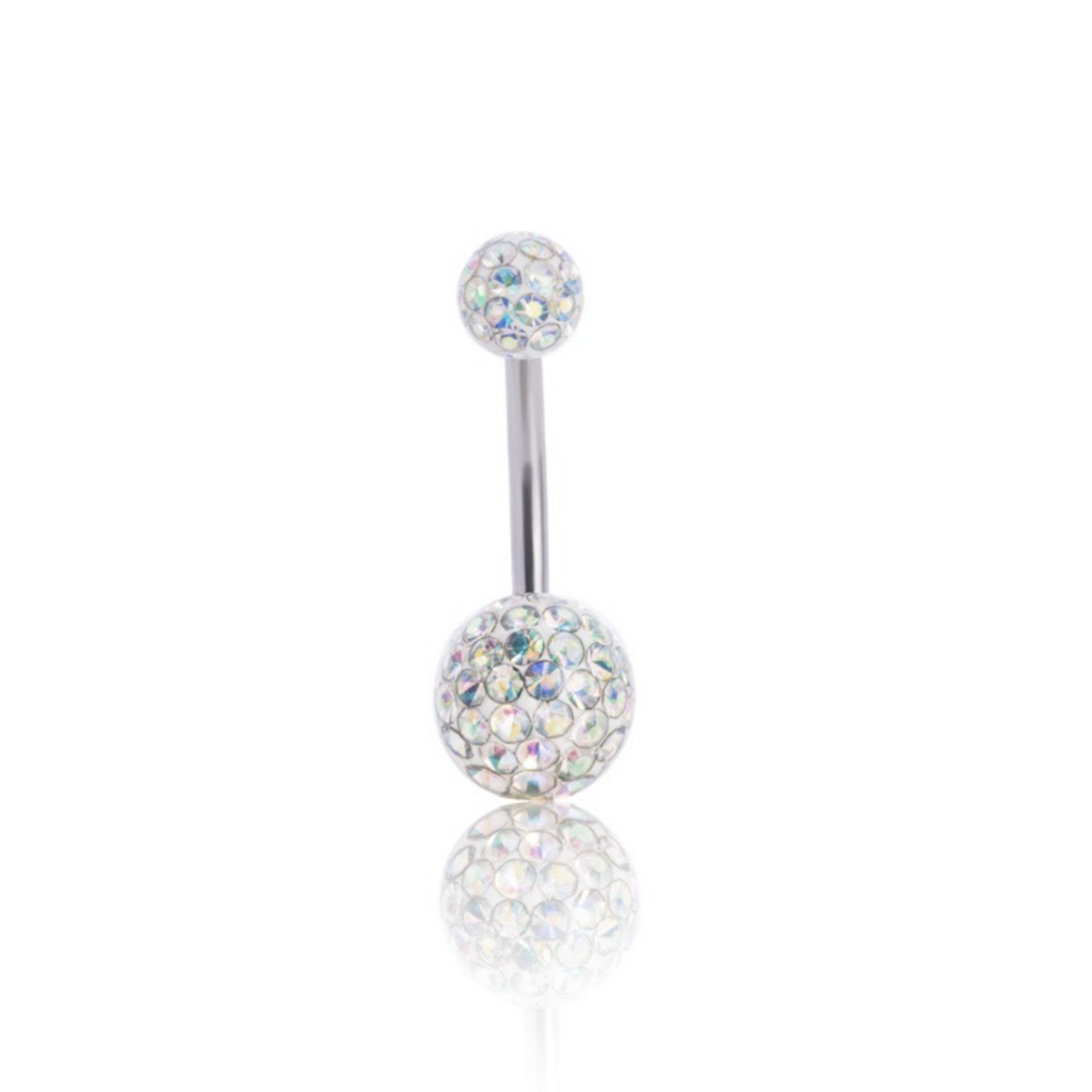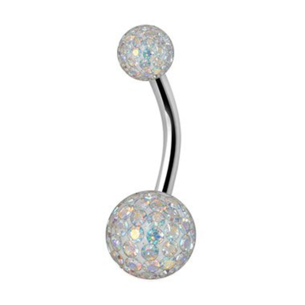 Prachtig, elegant en simpel! Deze sprankelende navelpiercing ingelegd met 'Aurora Borealis' premium zirkonia past bij elke bikini! Het staafje heeft een dikte van 1,6mm en een lengte van 10mm. De balletjes hebben diameters van 5mm en 8mm. Daarnaast is het geheel voorzien van een afschroefbaar balletje, welke ook ingelegd is met premium zirkonia.