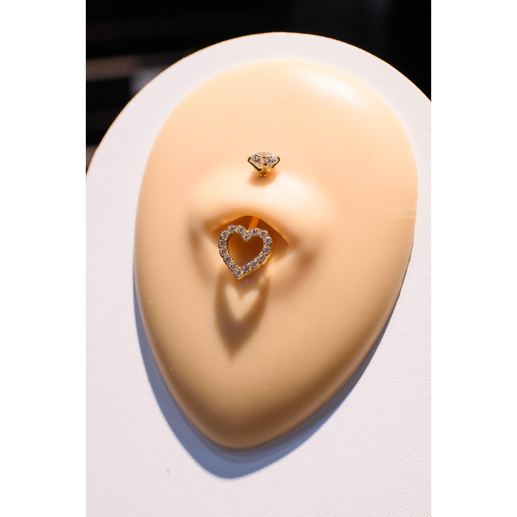 Deze vergulde navelpiercing is gemaakt van implant-grade titanium en heeft een open hartvormig design, omlijst door een fonkelende halo van heldere kristallen. Het hart staat symbool voor liefde en verbondenheid, terwijl de kristallen zorgen voor een elegante, verfijnde glans.