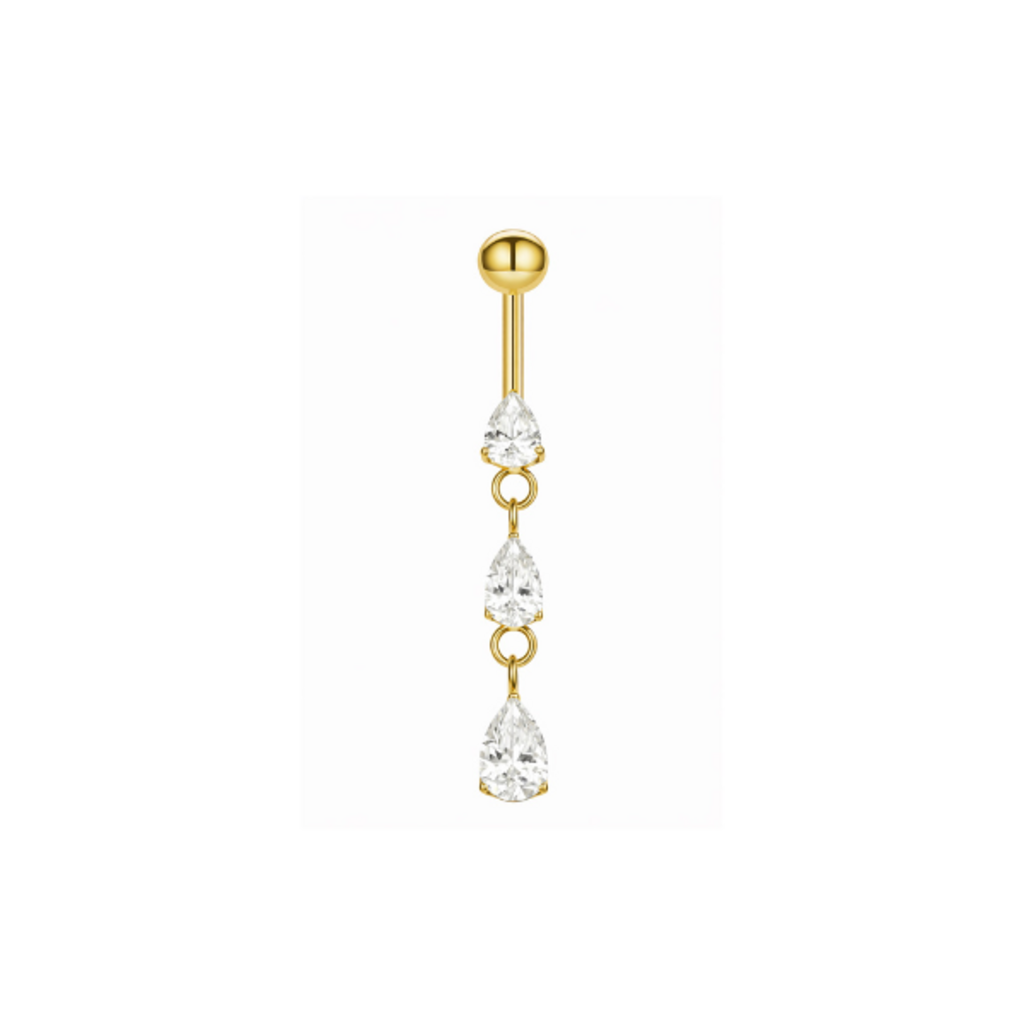 Deze vergulde navelpiercing is gemaakt van implant-grade titanium en heeft een verfijnd hangend design met drie druppelvormige heldere kristallen. De subtiele beweging zorgt voor extra schittering en geeft het sieraad een elegante, vrouwelijke uitstraling.