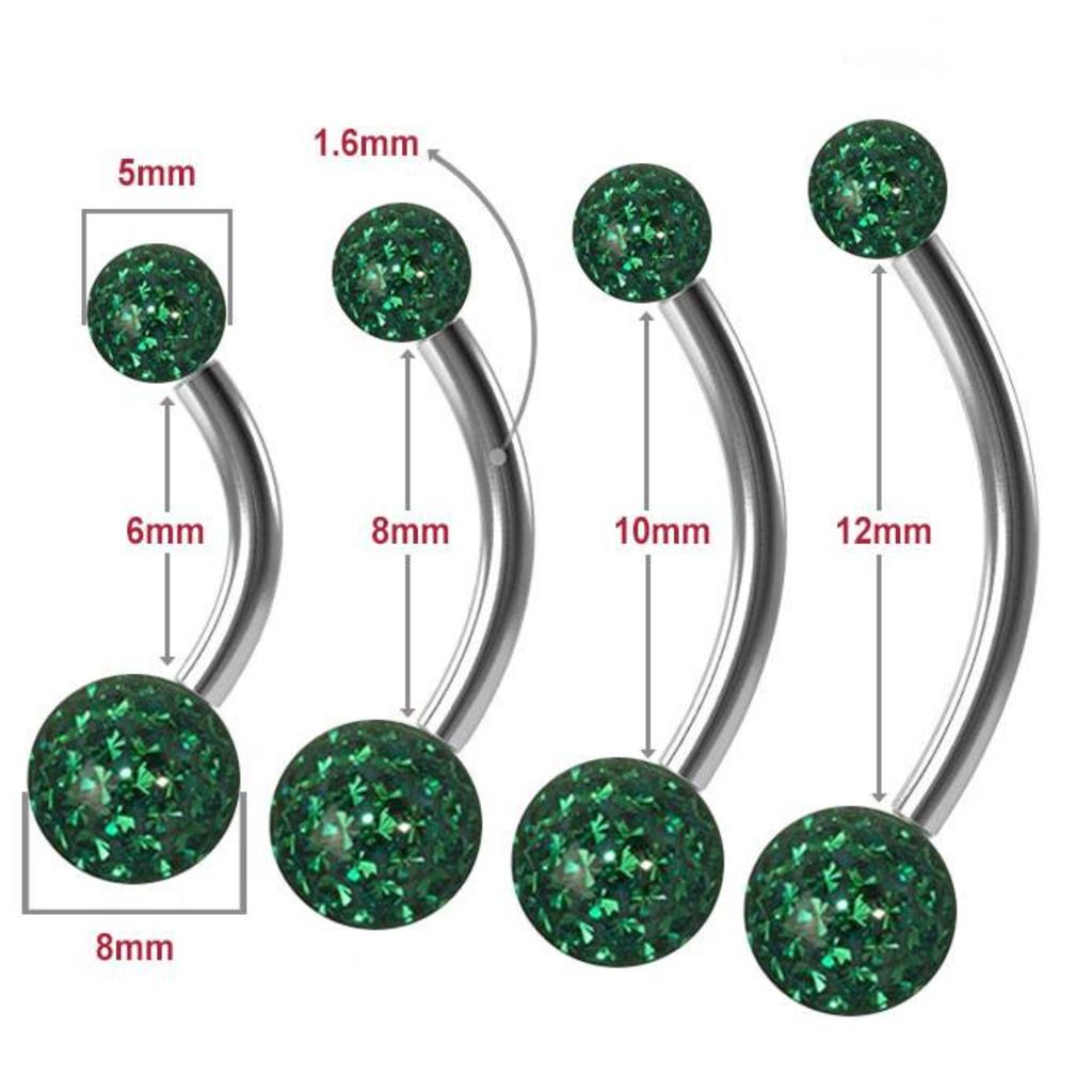 Het staafje heeft een dikte van 1,6mm en is verkrijgbaar in de lengtes: 6mm - 8mm - 12mm. De balletjes hebben diameters van 5mm en 8mm. Daarnaast is het geheel voorzien van een afschroefbaar balletje, welke ook ingelegd is met premium zirkonia.