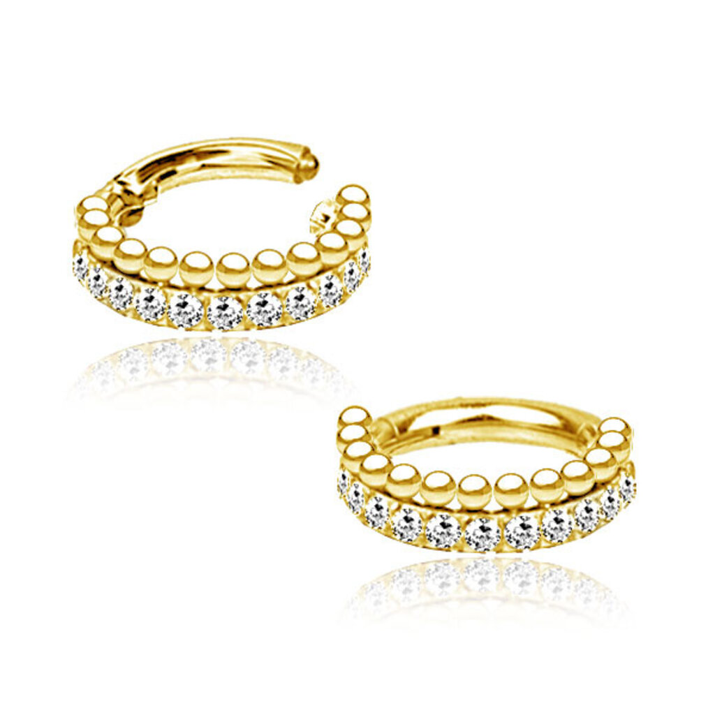 Geef je stijl een upgrade met een prachtige chirurgisch stalen piercing ring, ideaal voor verschillende oorpiercings, met stalen balletjes en heldere witte stenen. Daarnaast is de ring gemakkelijk te bevestigen en los te koppelen vanwege het eenvoudige clicksysteem welke voorzien is van een klein scharniertje.
