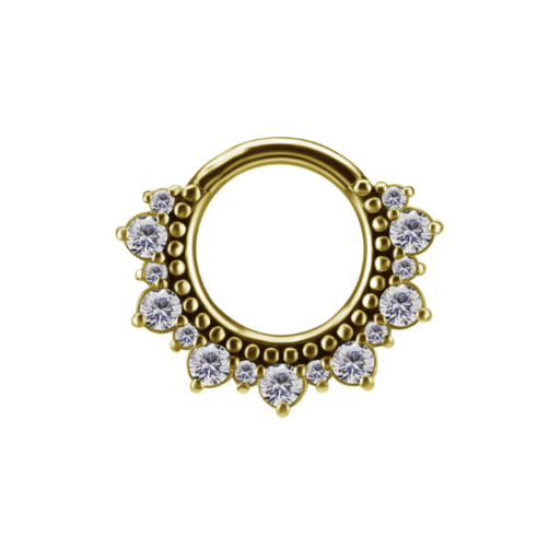 Ervaar de perfecte balans tussen luxe en verfijning met de Golden Radiance Septum & Daith Clicker. Dit adembenemende sieraad is vervaardigd uit 18K massief goud en verfraaid met sprankelende premium cubic zirconia steentjes. Het unieke ontwerp, met een delicate verdeling van fonkelende stenen en verfijnde gouden accenten, straalt pure elegantie uit. De clicker-sluiting zorgt voor een moeiteloze en veilige bevestiging, ideaal voor dagelijks gebruik en speciale gelegenheden.
