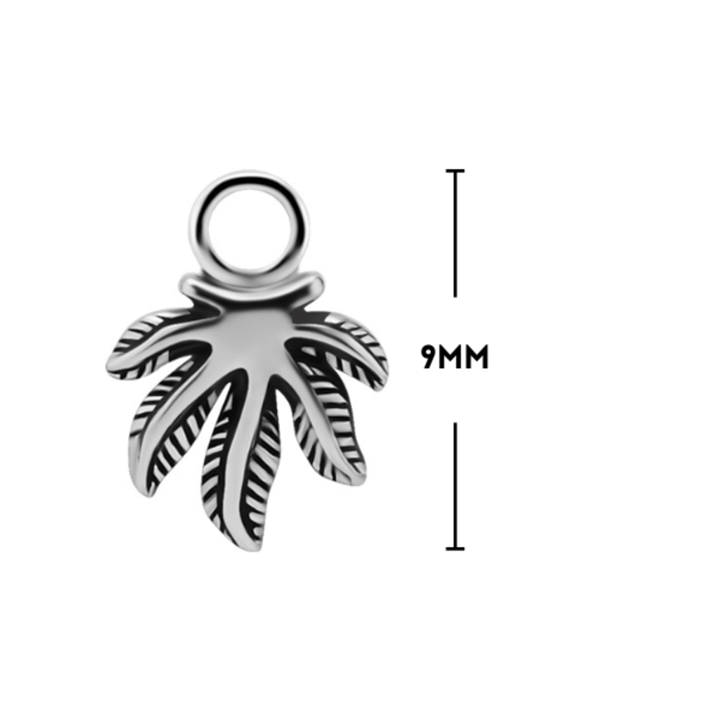 Deze charm, ontworpen naar de iconische vorm van een wietblad, is een opvallend en veelzijdig sieraad. Het is vakkundig vervaardigd uit chirurgisch staal, wat zowel hypoallergene eigenschappen als duurzaamheid waarborgt. Deze charm kan moeiteloos gecombineerd worden met een segment ring, waardoor het een perfect accessoire is voor een verscheidenheid aan lichaamspiercings.