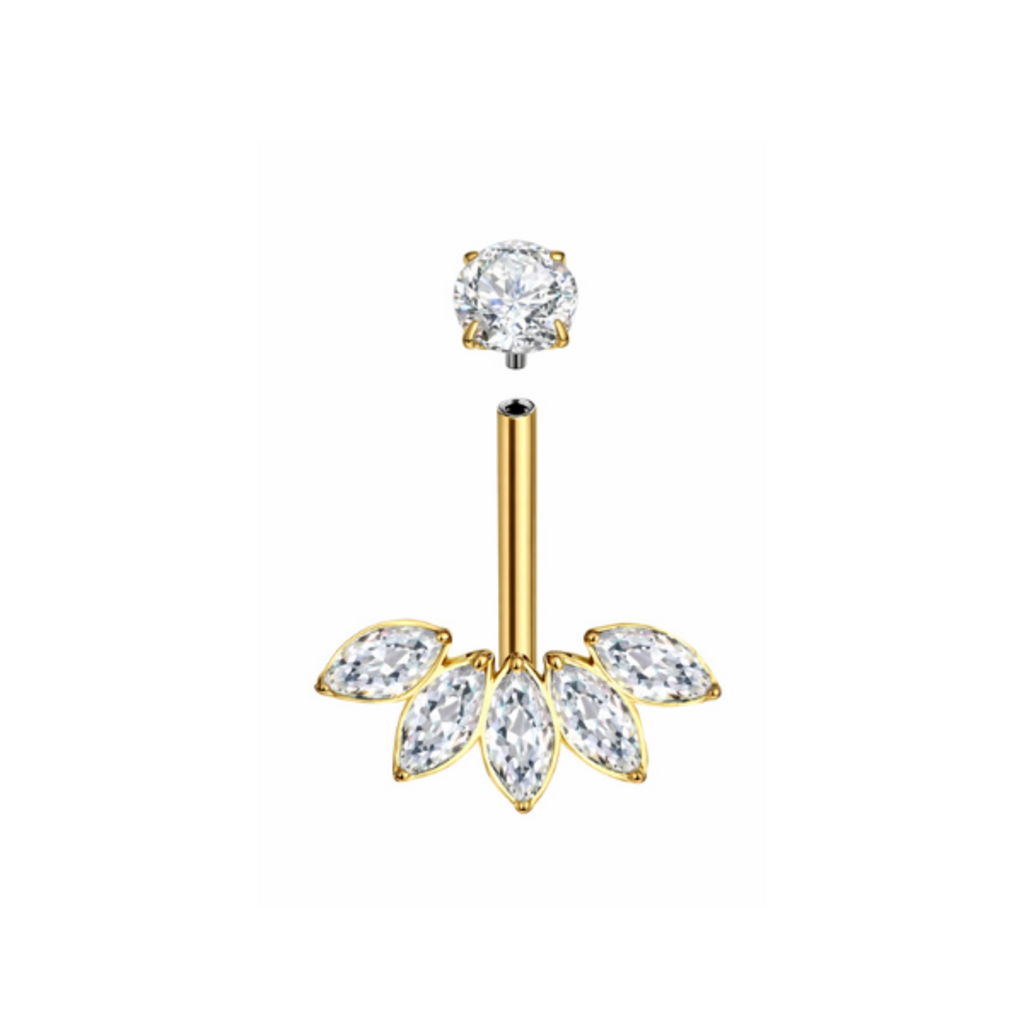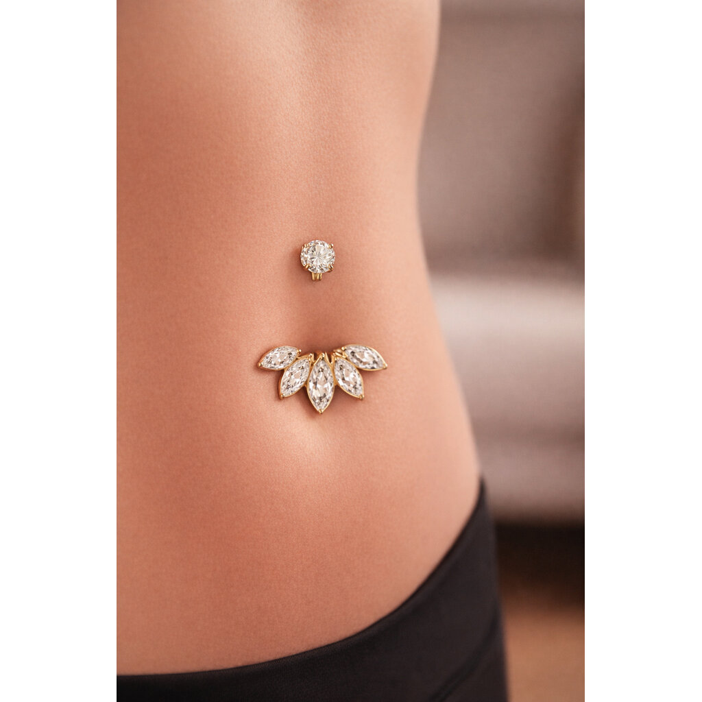 Deze vergulde navelpiercing is vervaardigd uit implant-grade titanium, wat zorgt voor optimaal draagcomfort en maximale huidvriendelijkheid. De verfijnde compositie van sprankelende kristallen in bladvorm geeft deze piercing een elegante, vrouwelijke en luxueuze uitstraling. De heldere kristallen top maakt het design compleet.