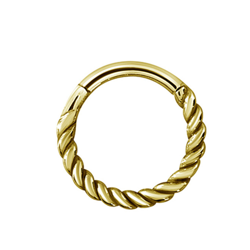 Deze elegante piercing heeft een klassiek twisted touw-design. De ring is verkrijgbaar in de dikte 1mm en in de diameter: 6mm of 7mm. Daarnaast is de ring gemakkelijk te bevestigen en los te koppelen vanwege het eenvoudige clicksysteem welke voorzien is van een klein scharniertje.